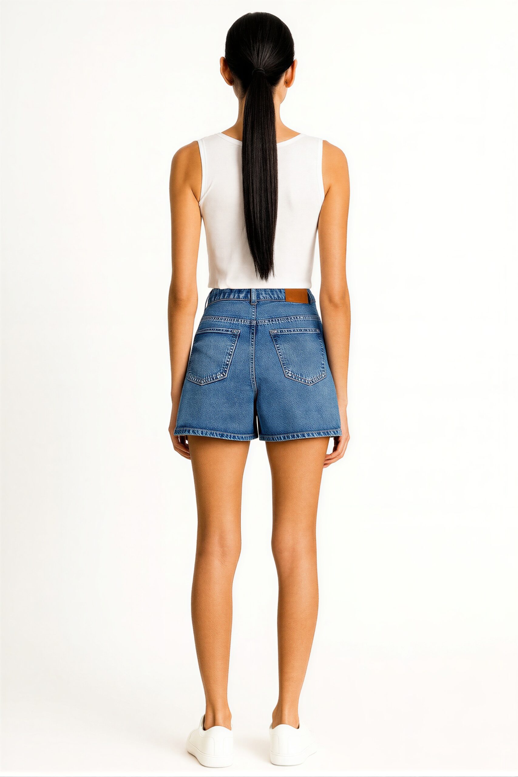 Short de mezclilla de tiro medio con pretina estructurada y cierre frontal funcional, bolsillos delanteros y traseros integrados que aportan practicidad, corte recto con largo corto que permite libertad de movimiento, confección en tejido firme que mantiene la forma durante el uso, terminación inferior con acabado deshilado controlado