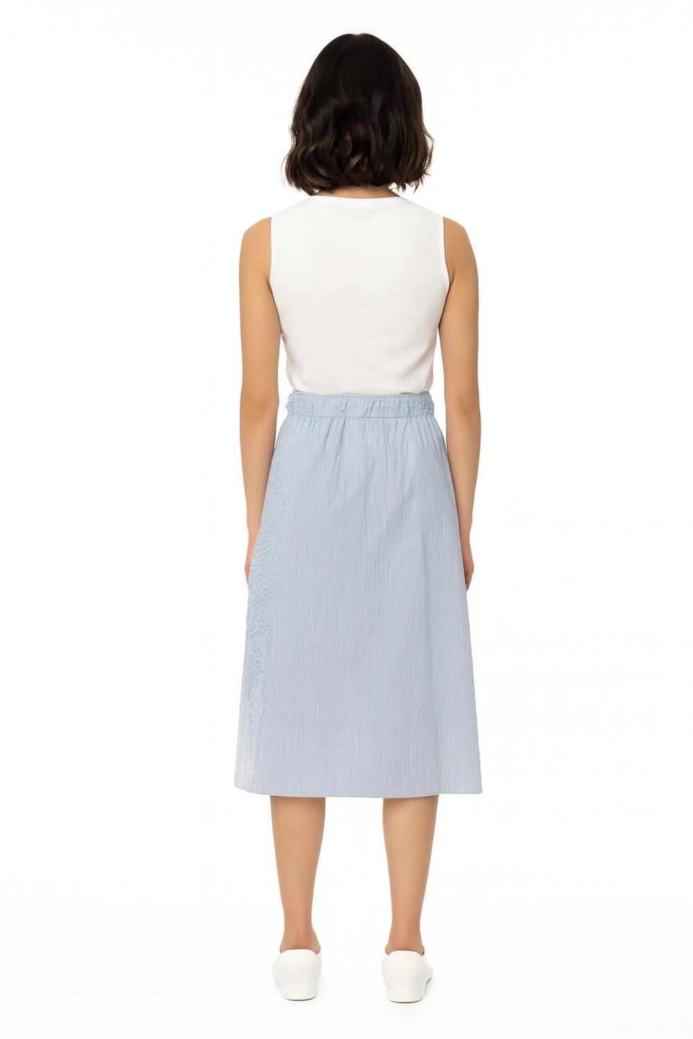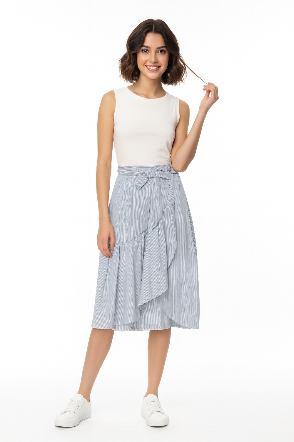 Falda de largo medio con diseño envolvente, ajuste con lazo lateral, pretina definida, caída fluida, estructura con olan inferior