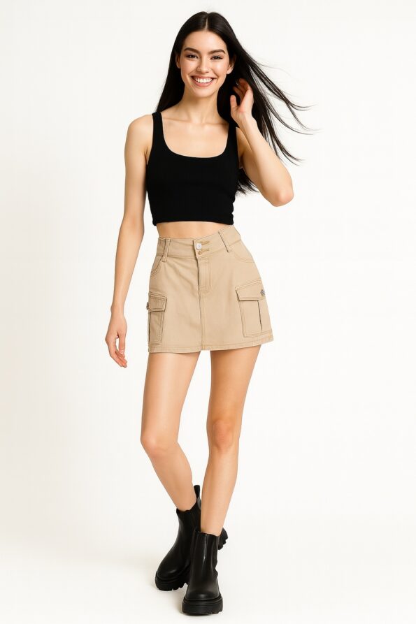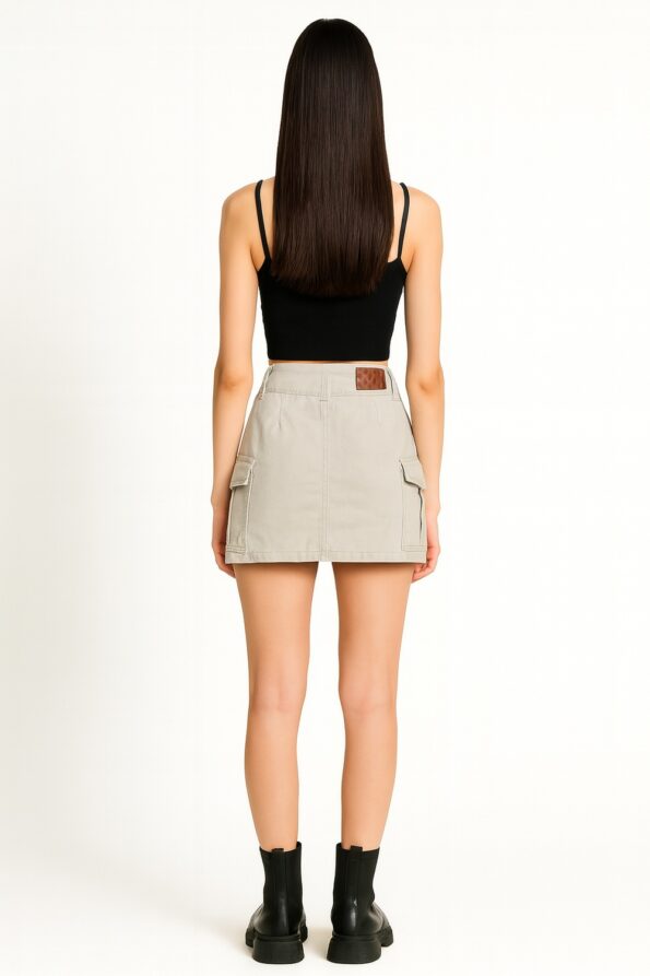 Minifalda de gabardina con diseño moderno de bolsas cargo laterales que aportan estilo utilitario, pretina ancha con doble botón metálico y cierre oculto que brindan soporte, corte ajustado que define la figura, bolsillos frontales funcionales que suman practicidad, confección en tejido resistente con tacto suave y acabado limpio que realza su apariencia estructurada