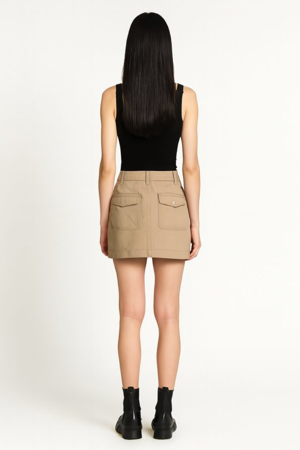 Minifalda de gabardina con diseño moderno de bolsas cargo laterales que aportan estilo utilitario, pretina ancha con doble botón metálico y cierre oculto que brindan soporte, corte ajustado que define la figura, bolsillos frontales funcionales que suman practicidad, confección en tejido resistente con tacto suave y acabado limpio que realza su apariencia estructurada
