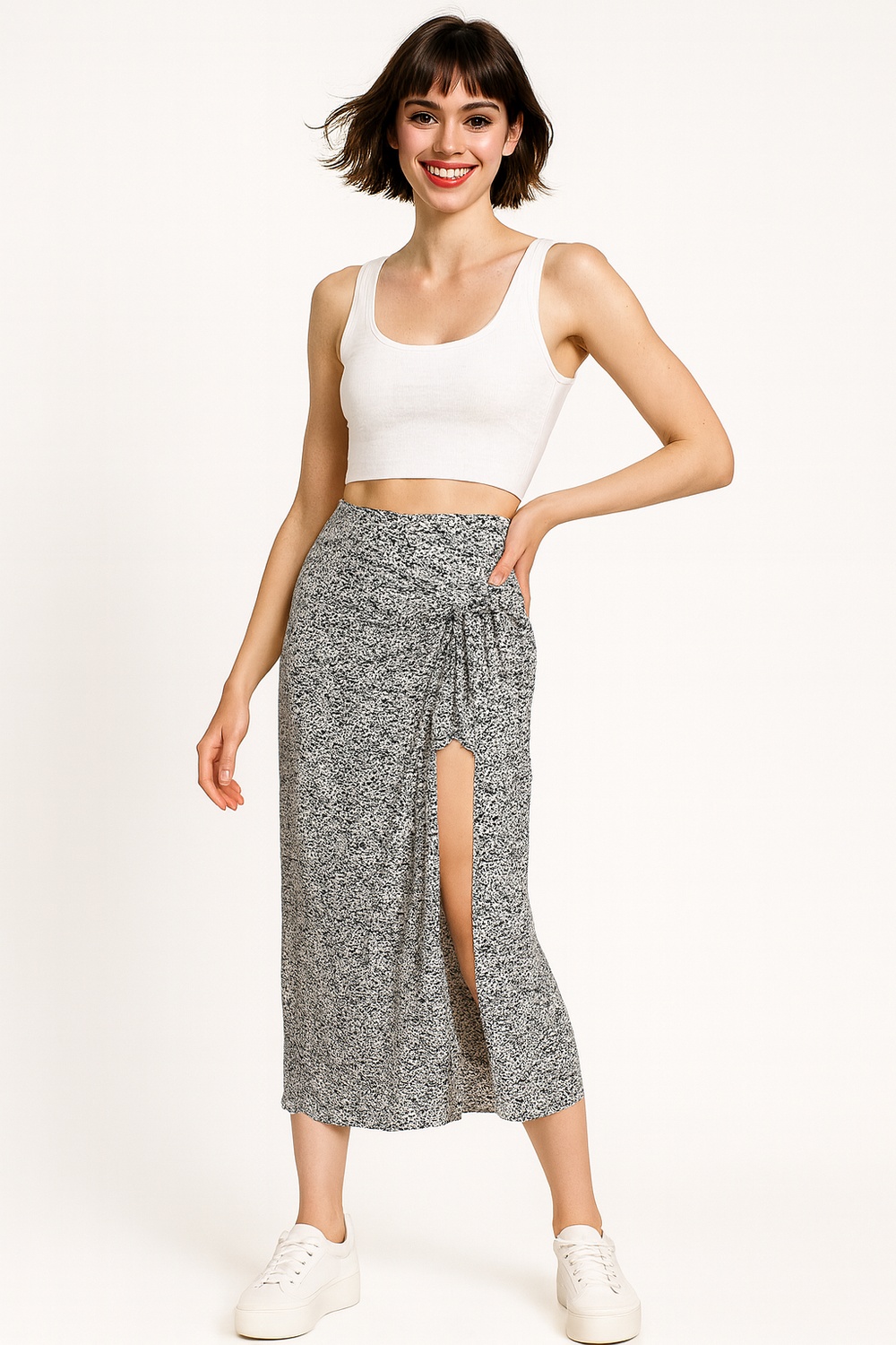 Minifalda envolvente con pretina ancha y amarre lateral que permite un ajuste personalizado, corte corto que aporta un estilo juvenil y moderno, confección en tejido crepé de textura ligera que brinda frescura y comodidad, terminados prolijos que elevan la prenda con un acabado sofisticado y versátil