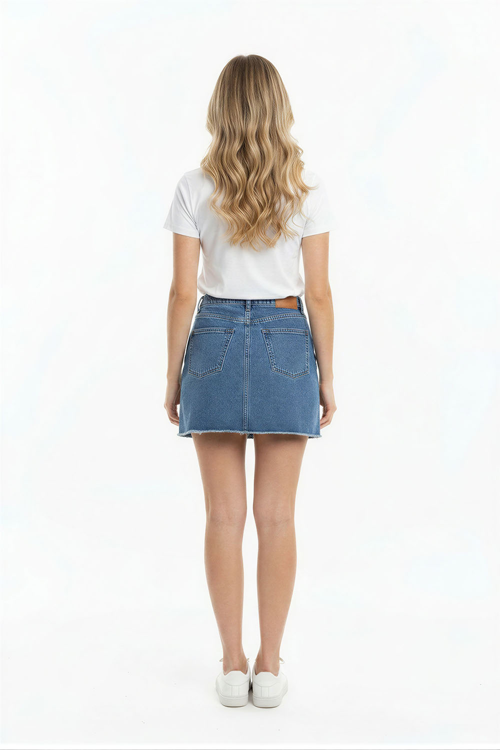 Minifalda de tiro medio con corte recto que estiliza la silueta, diseño con pretina firme y cierre frontal con botón que brinda ajuste seguro, bolsillos funcionales que aportan practicidad, confección en mezclilla rígida que mantiene la estructura, acabado deshilachado en bastilla que añade detalle moderno