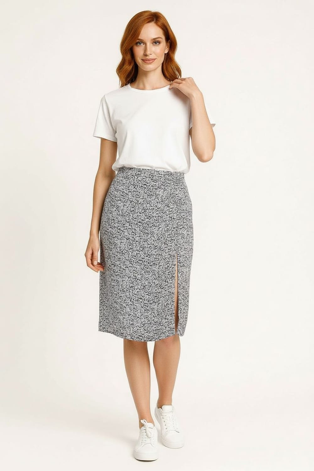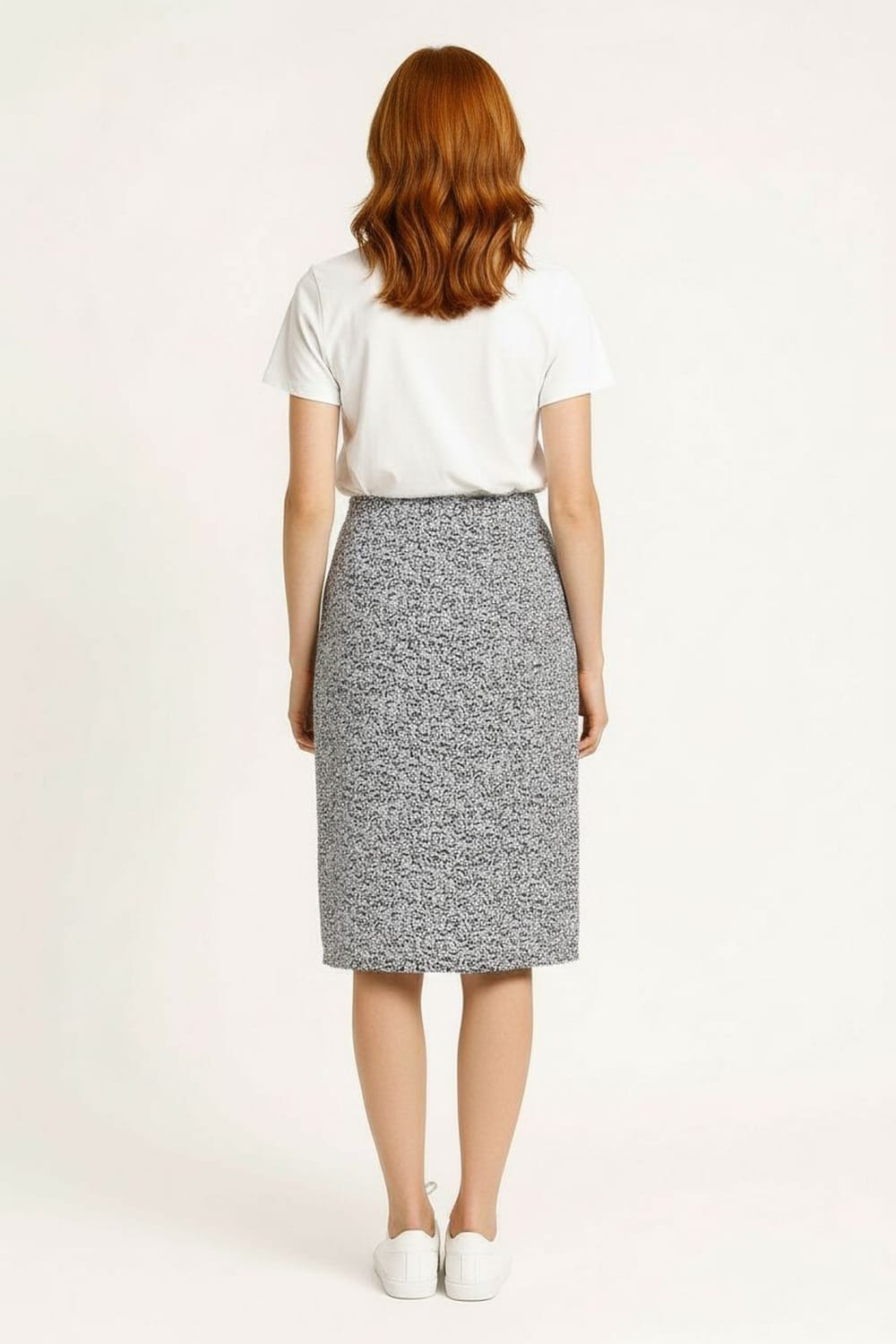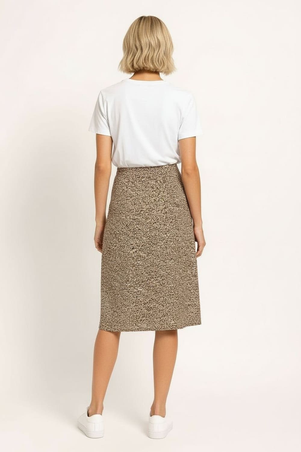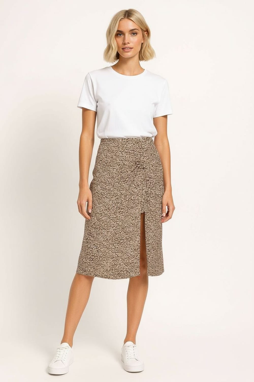 Falda de largo midi con pretina amplia que define la cintura, corte envolvente con abertura lateral que aporta movimiento al caminar, confección en challis ligero de textura suave que brinda frescura, caída fluida que estiliza la silueta, ajuste cómodo en cintura que permite uso prolongado sin incomodidad