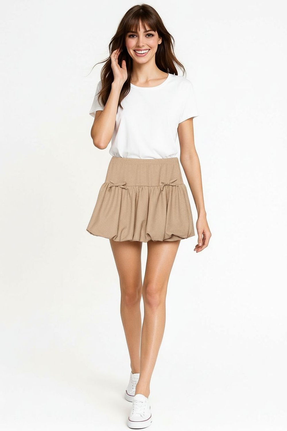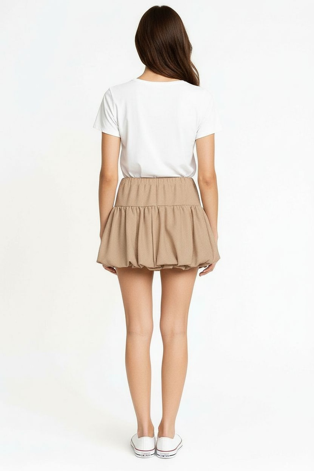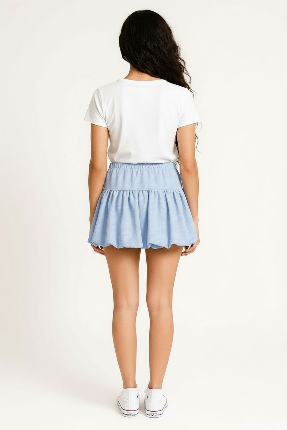 Minifalda de pretina ancha, corte corto con volumen, fruncido en unión inferior, silueta amplia, confección ligera con caída suave