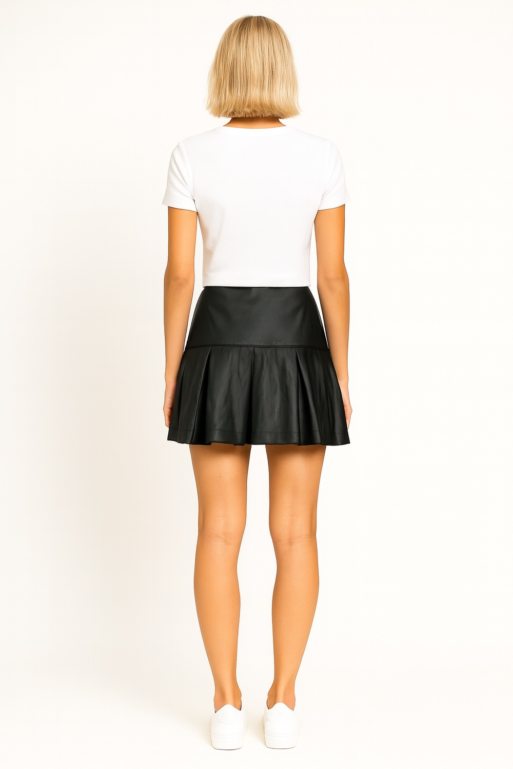 Minifalda con pretina ancha que brinda soporte al ajuste, diseño con tablas amplias que aportan movimiento, confección en material de acabado grueso con textura lisa que realza el diseño, corte corto que resalta las piernas y realza la figura