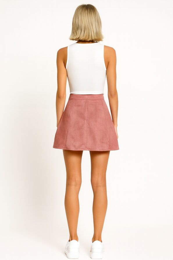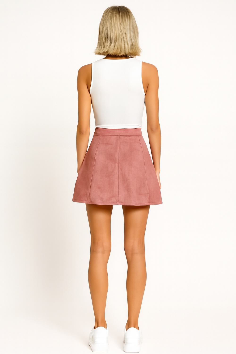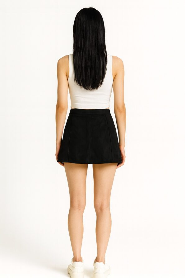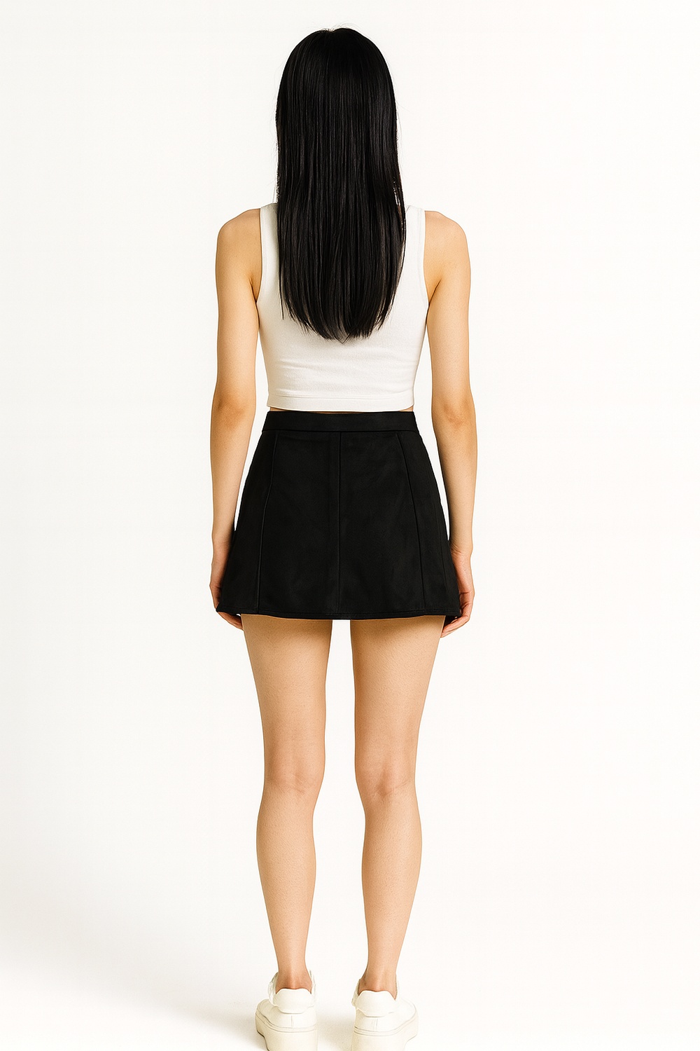 Minifalda de tiro alto con pretina ajustada que brinda soporte y comodidad, diseño con tablones marcados que aportan movimiento y estilo juvenil, detalle de hebillas metálicas laterales que realzan el diseño moderno, confección en tejido tipo gamuza suave que ofrece un acabado elegante, ideal para outfits casuales y combinaciones versátiles de temporada
