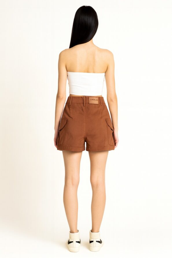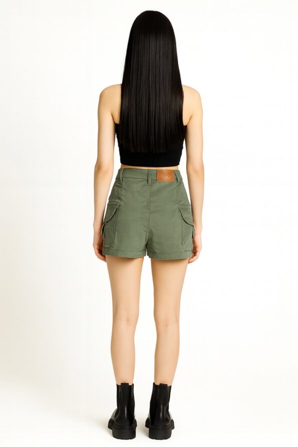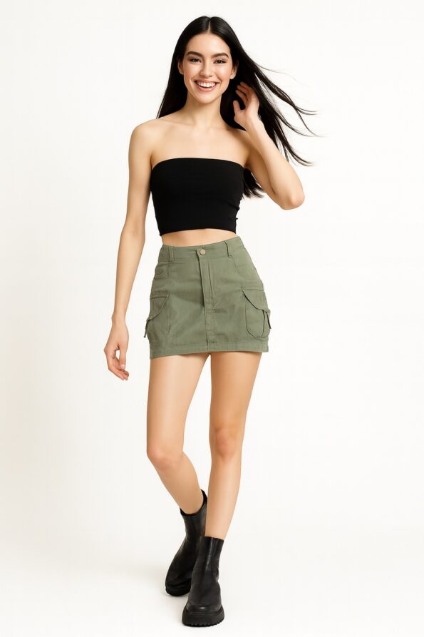Falda short con pretina de tiro medio que brinda soporte y comodidad, diseño con bolsas laterales tipo cargo que aportan un toque funcional y moderno, cierre frontal con botón y cierre metálico para un ajuste seguro, confección en tela suave con ligera estructura que permite movilidad, detalle de costuras visibles que realzan la forma de la prenda