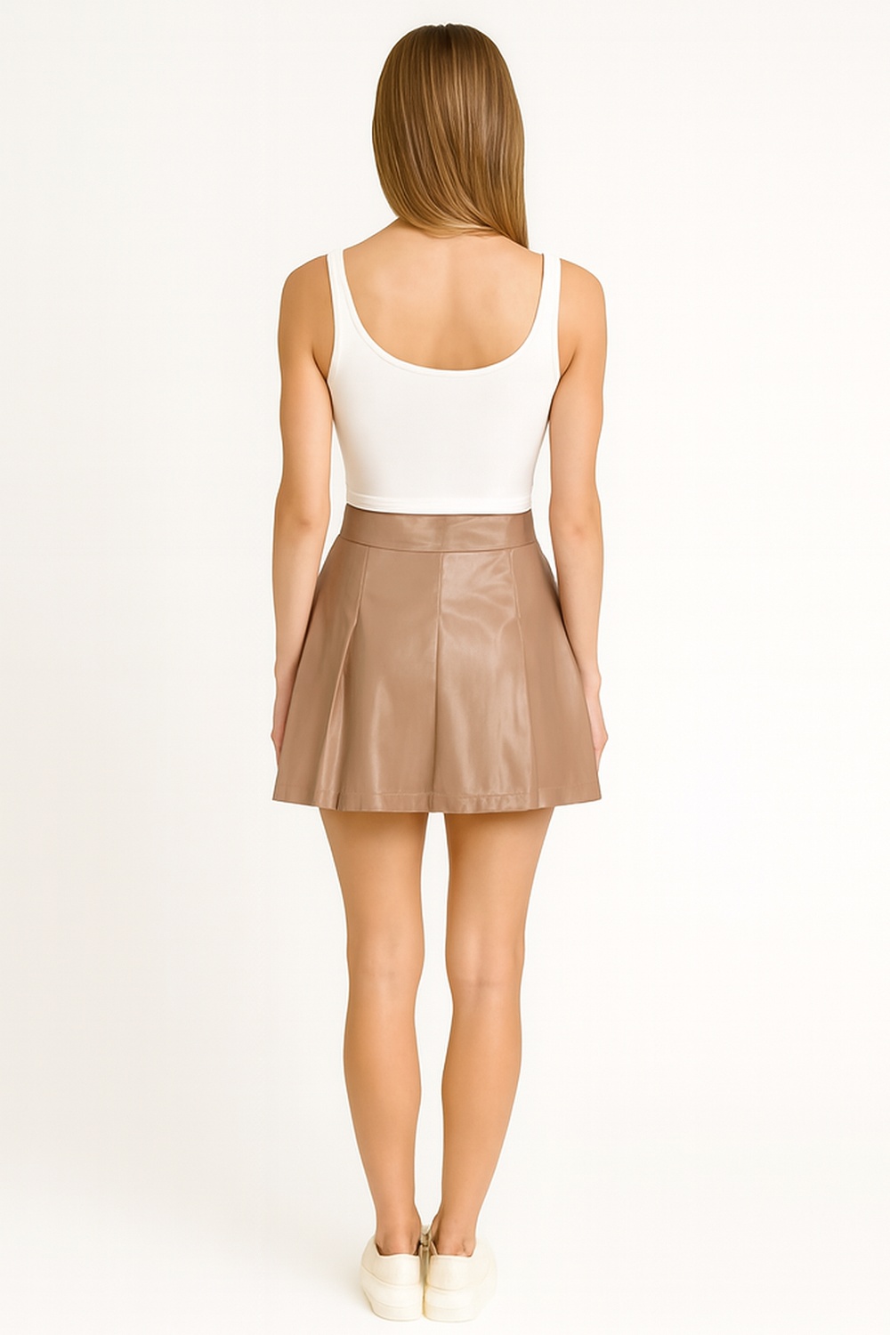 Falda short con diseño de tablones al frente que aporta volumen y estilo moderno, pretina ancha con botón lateral que brinda ajuste seguro, silueta corta con short interno que añade practicidad y comodidad, confeccionada en tejido resistente con acabado suave, costuras reforzadas que aseguran mayor durabilidad