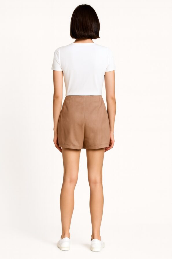Falda short de tiro alto con diseño cruzado al frente que aporta un detalle sofisticado, pretina lisa que asegura un ajuste cómodo, confección en tela suave con forro tipo short que brinda libertad de movimiento, acabado limpio que favorece la silueta y versatilidad para outfits juveniles y combinaciones casuales de temporada
