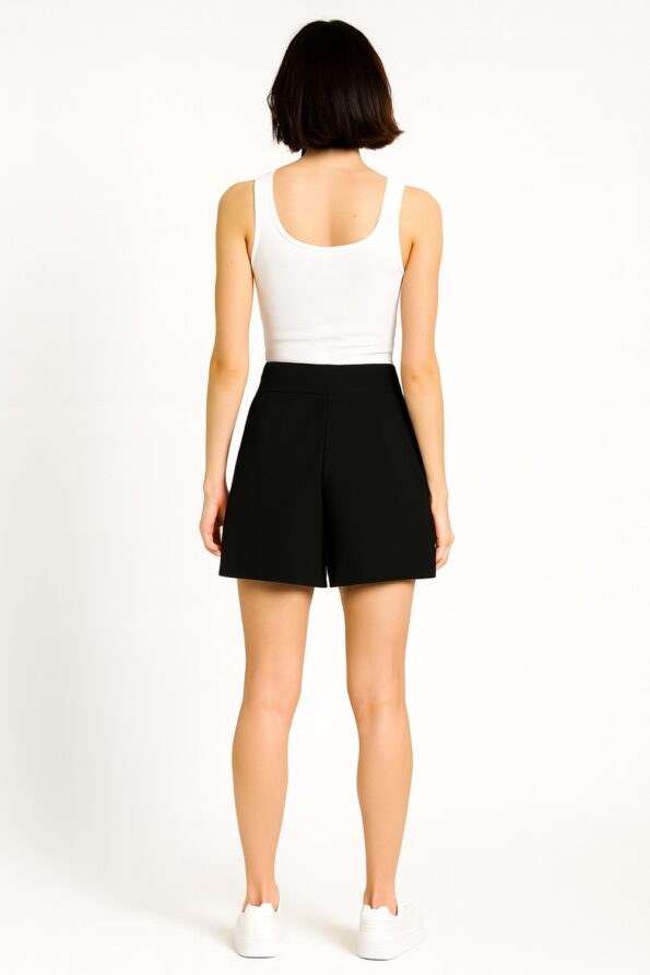 Minifalda tipo short con diseño tableado que aporta movimiento y frescura, pretina ancha que brinda ajuste cómodo y seguro, detalle de aplicación decorativa en la cintura que añade un toque sofisticado, confección en tela ligera y resistente que favorece la movilidad, prenda práctica y moderna que combina estilo y funcionalidad en un solo diseño