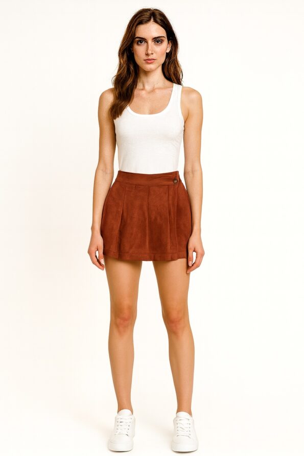 Falda short con diseño tableado al frente que aporta movimiento y estilo, pretina con botón lateral que asegura ajuste cómodo, silueta corta con short interno que brinda seguridad y practicidad, confeccionada en tejido resistente con acabado suave al tacto, costuras reforzadas que garantizan durabilidad