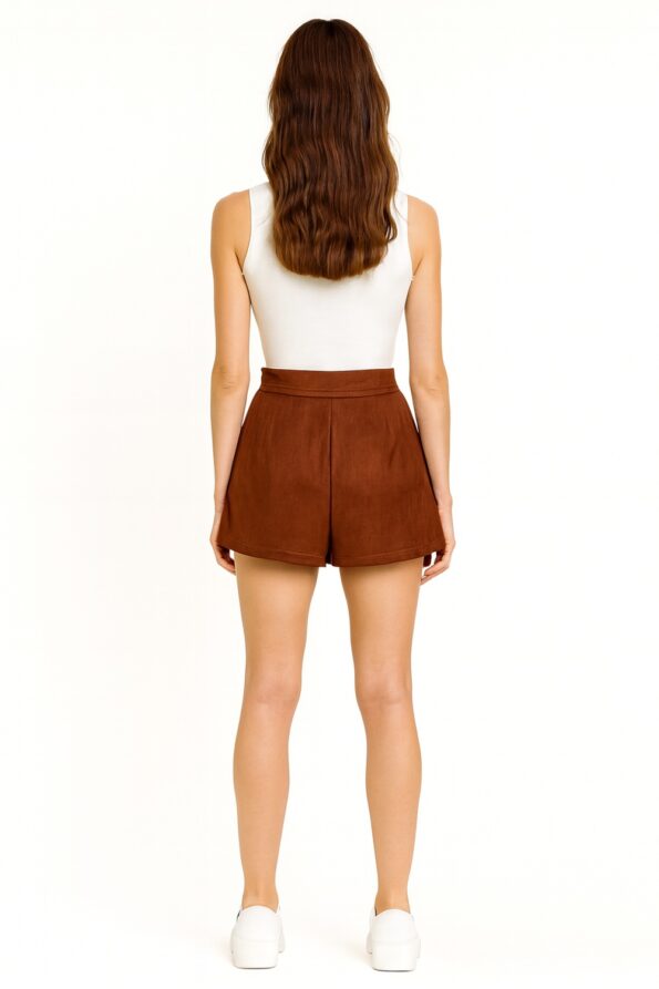 Minifalda tipo short con cruce frontal y botones decorativos que aportan un estilo elegante, diseño en jacquard con patrón clásico que realza la silueta, corte corto moderno ideal para looks urbanos y sofisticados, confección en tejido estructurado que brinda comodidad y firmeza