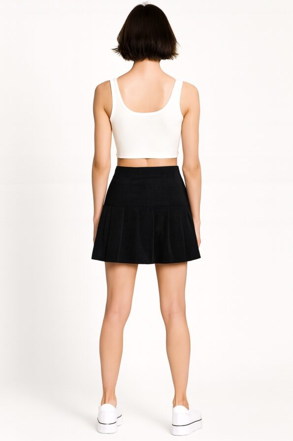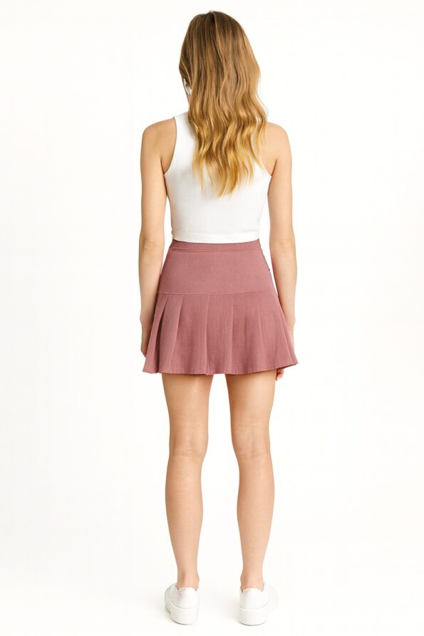 Falda short con diseño de tablones al frente que aporta volumen y estilo moderno, pretina ancha con botón lateral que brinda ajuste seguro, silueta corta con short interno que añade practicidad y comodidad, confeccionada en tejido resistente con acabado suave, costuras reforzadas que aseguran mayor durabilidad