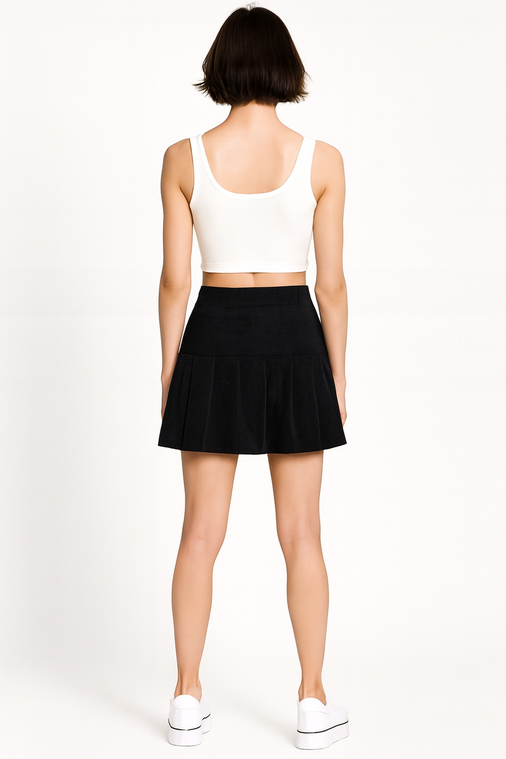 Minifalda en línea A con diseño de tablas que aportan volumen y movimiento, pretina ancha que define la cintura y asegura un ajuste cómodo, corte corto juvenil ideal para looks modernos de temporada, confección ligera con caída fluida que brinda frescura y versatilidad en cada outfit