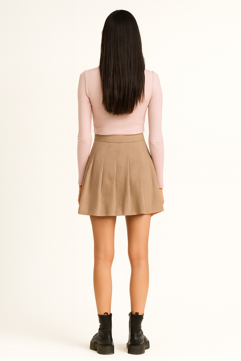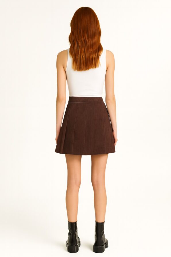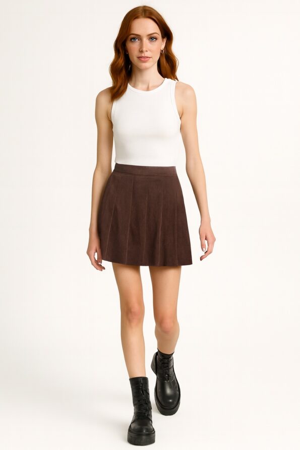 Minifalda de tiro alto con pretina ajustada que brinda soporte y comodidad, diseño con tablones marcados que aportan movimiento y estilo juvenil, detalle de hebillas metálicas laterales que realzan el diseño moderno, confección en tejido tipo gamuza suave que ofrece un acabado elegante, ideal para outfits casuales y combinaciones versátiles de temporada