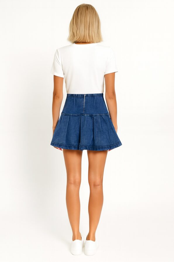 Minifalda confeccionada en mezclilla con pretina ancha que define la cintura, diseño con tablas amplias que aportan volumen y movimiento, tapas decorativas al frente con botones metálicos que realzan el estilo moderno, cierre posterior que facilita el ajuste y acabado resistente que mantiene la forma del diseño