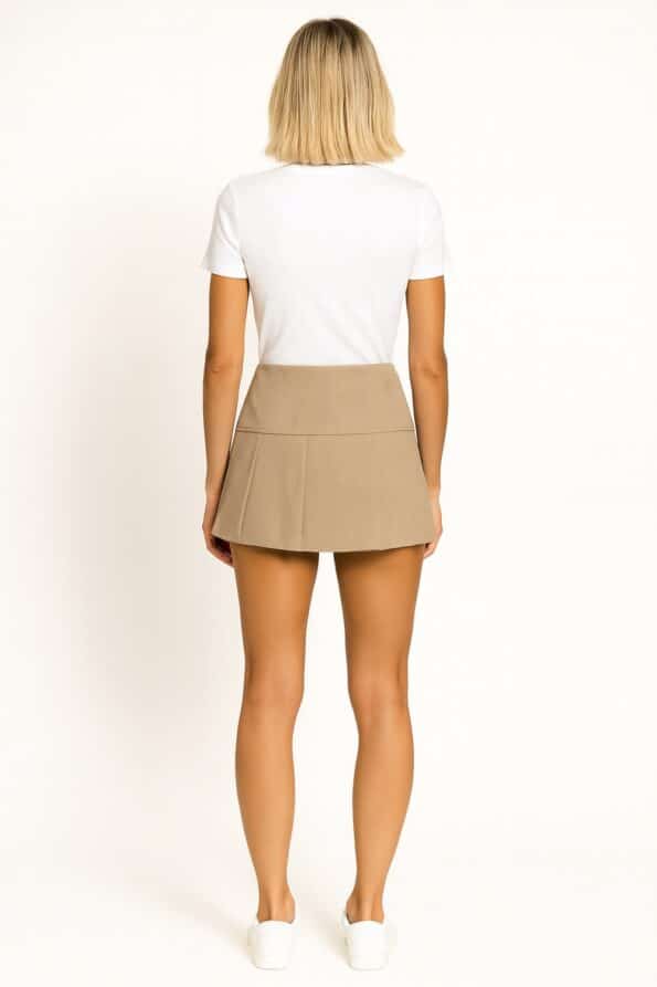 Minifalda tipo short con diseño tableado que aporta movimiento y frescura, pretina ancha que brinda ajuste cómodo y seguro, detalle de aplicación decorativa en la cintura que añade un toque sofisticado, confección en tela ligera y resistente que favorece la movilidad, prenda práctica y moderna que combina estilo y funcionalidad en un solo diseño