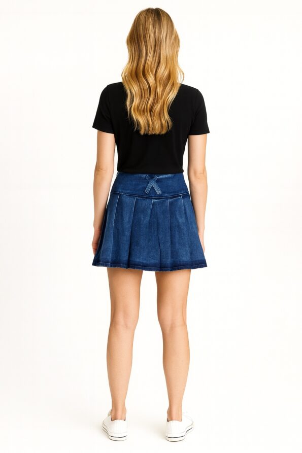 Minifalda confeccionada en mezclilla con diseño tableado que aporta movimiento juvenil, pretina ancha con cinturón del mismo material y hebilla metálica decorativa que brinda ajuste seguro, corte corto con toque actual, confección en tejido resistente de tacto suave