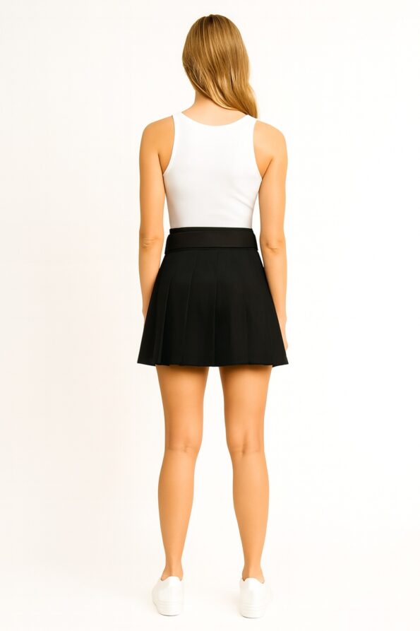 Minifalda con diseño tableado que aporta movimiento y volumen, pretina con cinturón y hebilla que asegura ajuste personalizado, corte corto que estiliza la silueta, confeccionada en tejido resistente con caída ligera, terminaciones limpias y costuras reforzadas que brindan durabilidad