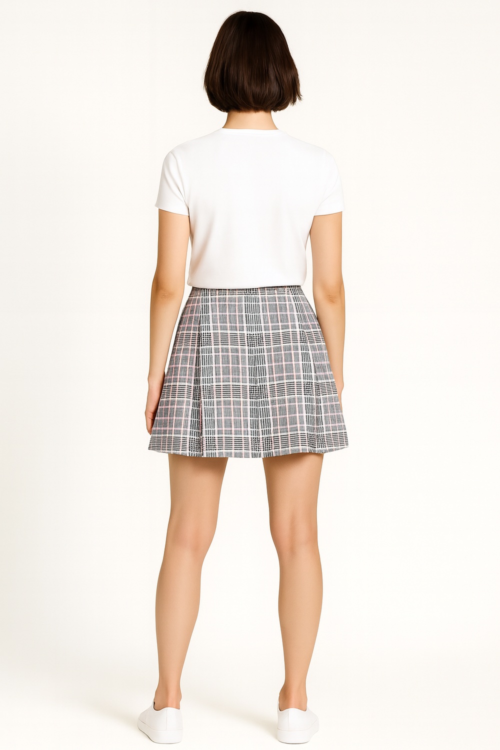 Falda corta con diseño de tablones que aporta volumen y movimiento dinámico, pretina ancha que asegura un ajuste firme y cómodo en la cintura, corte superior estructurado que realza la silueta, largo por encima de la rodilla que brinda un estilo juvenil y versátil, confección en tela resistente que conserva la forma de los pliegues y garantiza durabilidad
