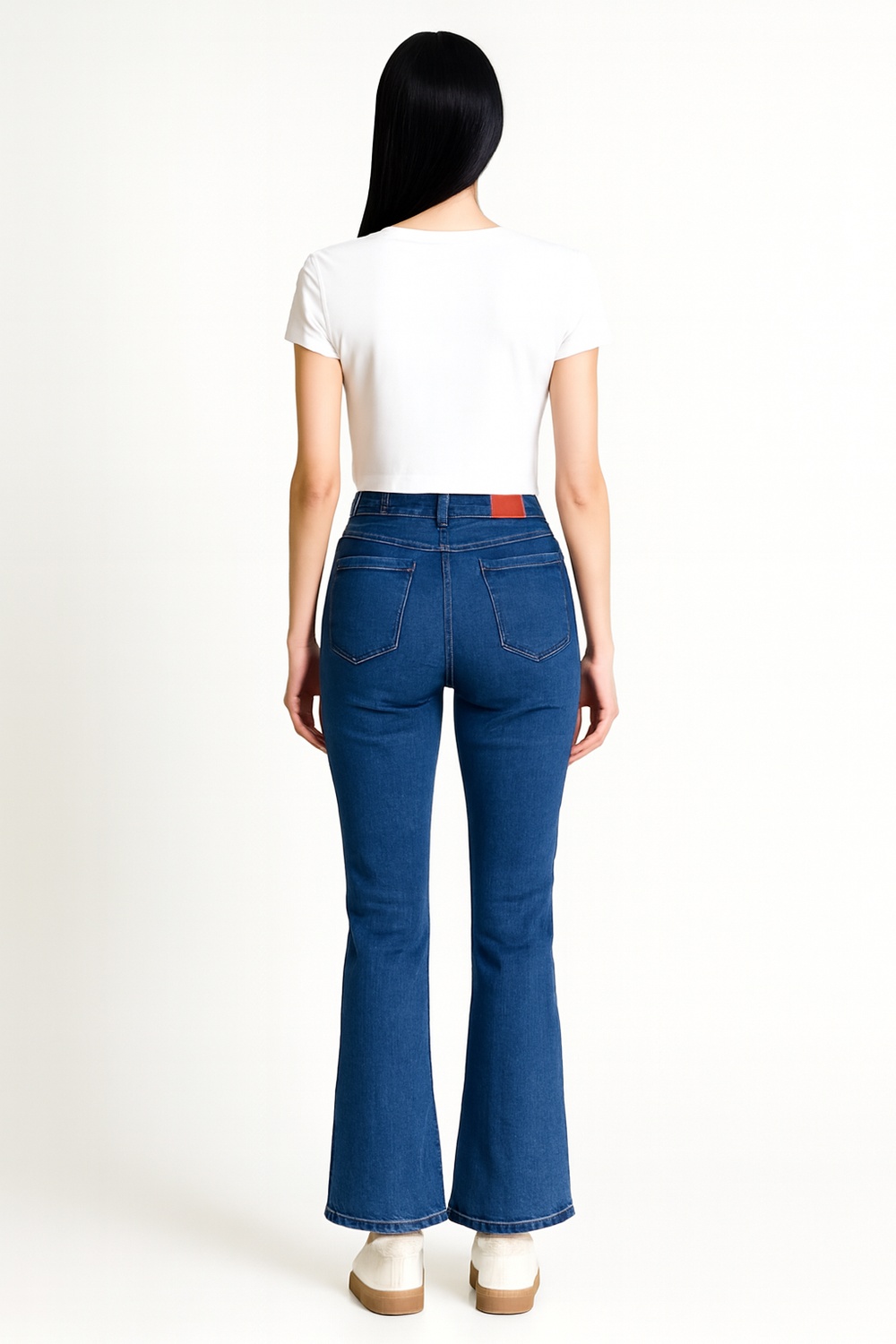 Jeans de tiro medio con ajuste firme en la cadera, corte campana que aporta amplitud en la parte baja, cinco bolsillos funcionales que ofrecen practicidad, confección denim resistente que mantiene la forma, pretina con botón metálico que asegura cierre estable y cómodo
