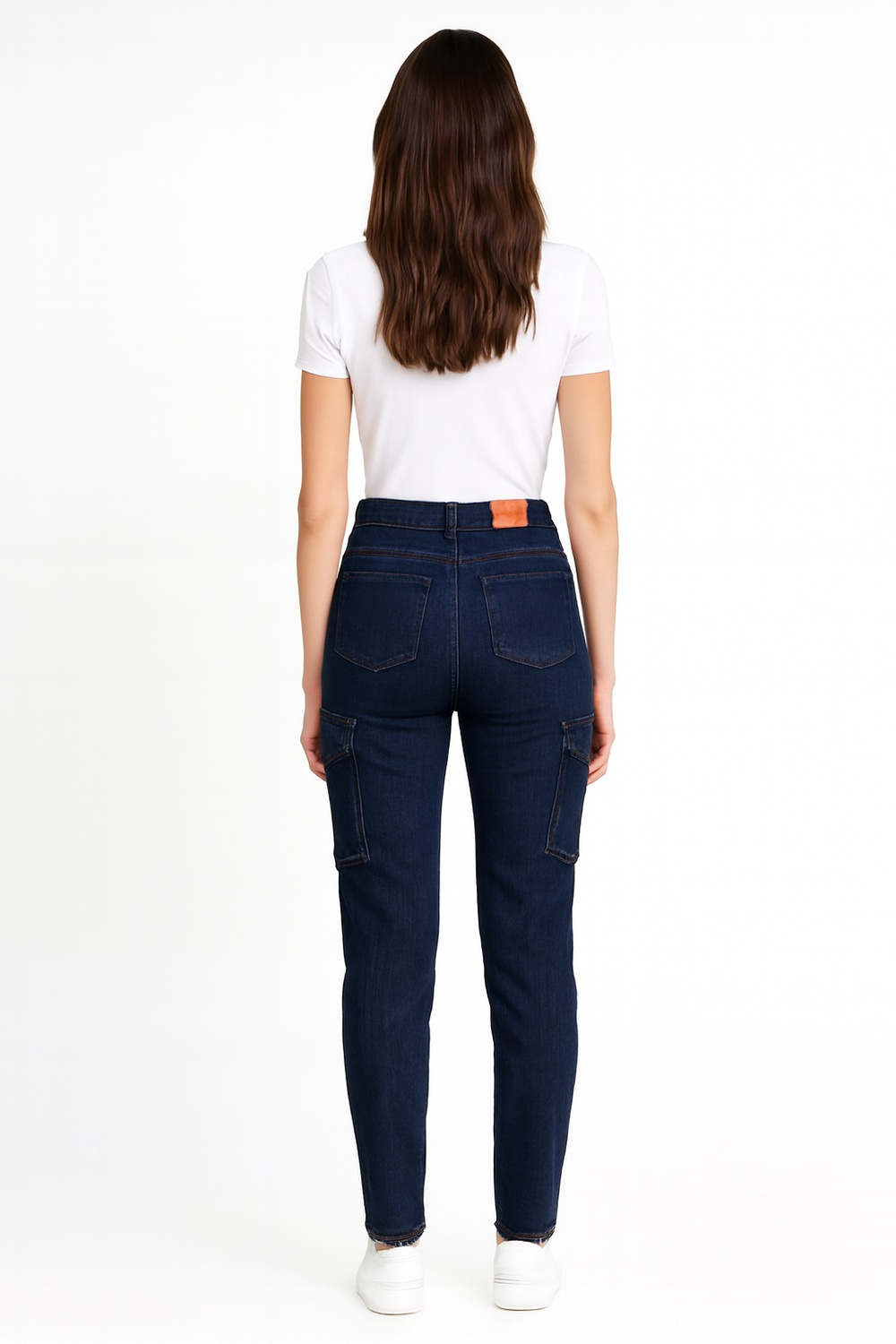 Jeans de corte cargo con bolsas laterales y pierna amplia, confeccionado en mezclilla stretch para mayor comodidad y ajuste, estilo moderno ideal para looks casuales y urbanos