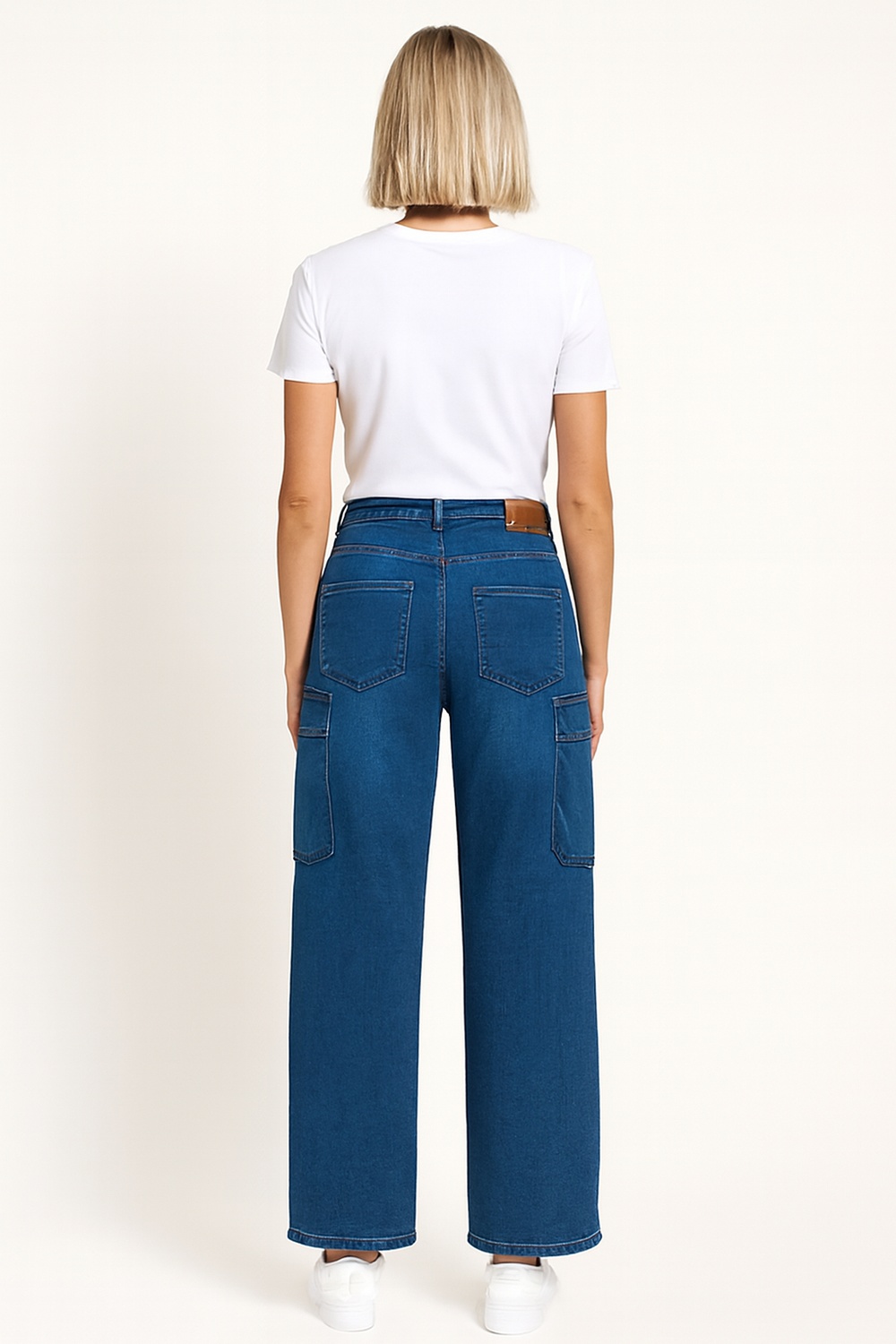 Jeans de tiro medio con corte amplio que brinda libertad de movimiento, bolsas laterales tipo cargo con tapa que aportan funcionalidad práctica, pretina con trabillas para asegurar distintos tipos de cinturón, pernera recta que estructura la caída del tejido, costura visible que refuerza cada panel, longitud completa que favorece distintas alturas