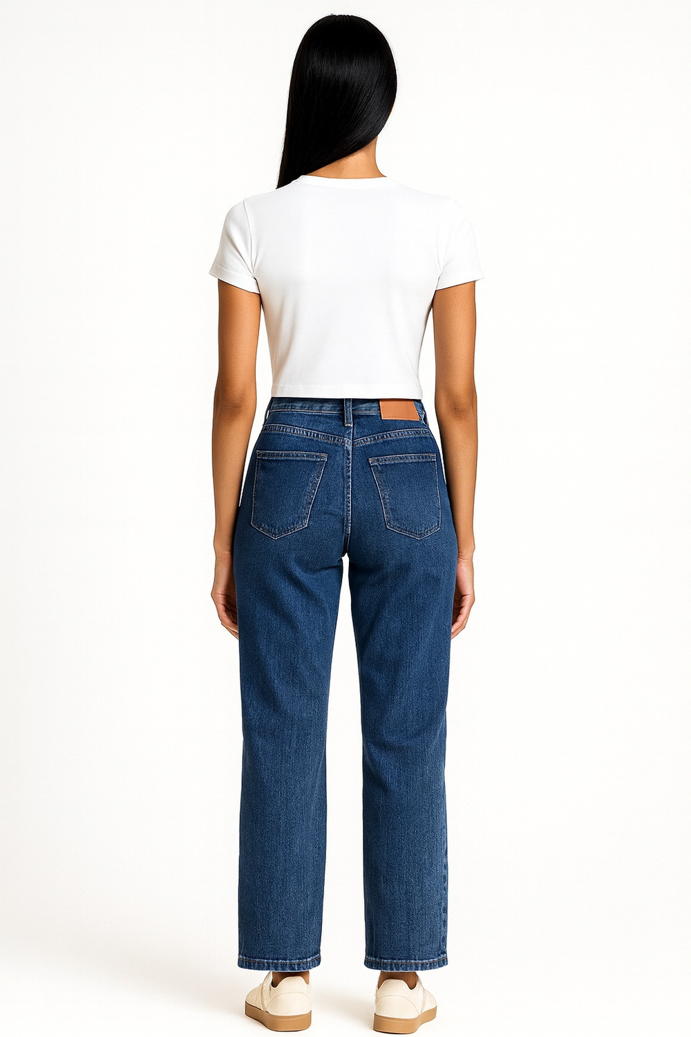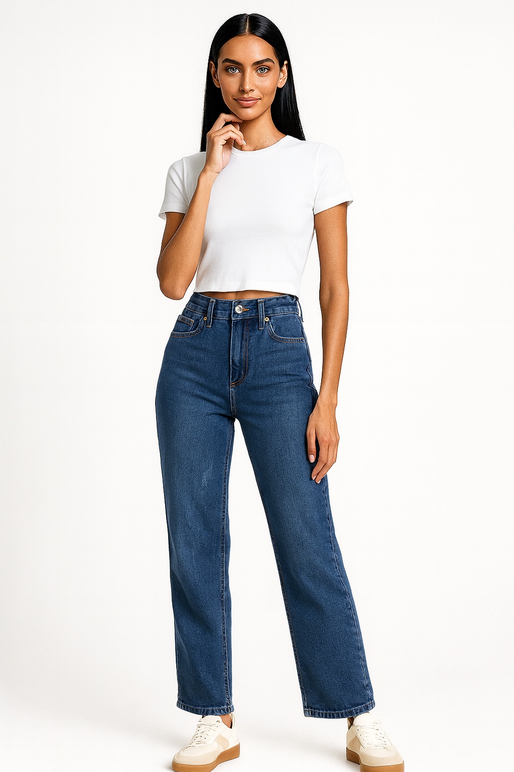 Jeans de tiro medio con ajuste firme en la cadera, corte campana que aporta amplitud en la parte baja, cinco bolsillos funcionales que ofrecen practicidad, confección denim resistente que mantiene la forma, pretina con botón metálico que asegura cierre estable y cómodo