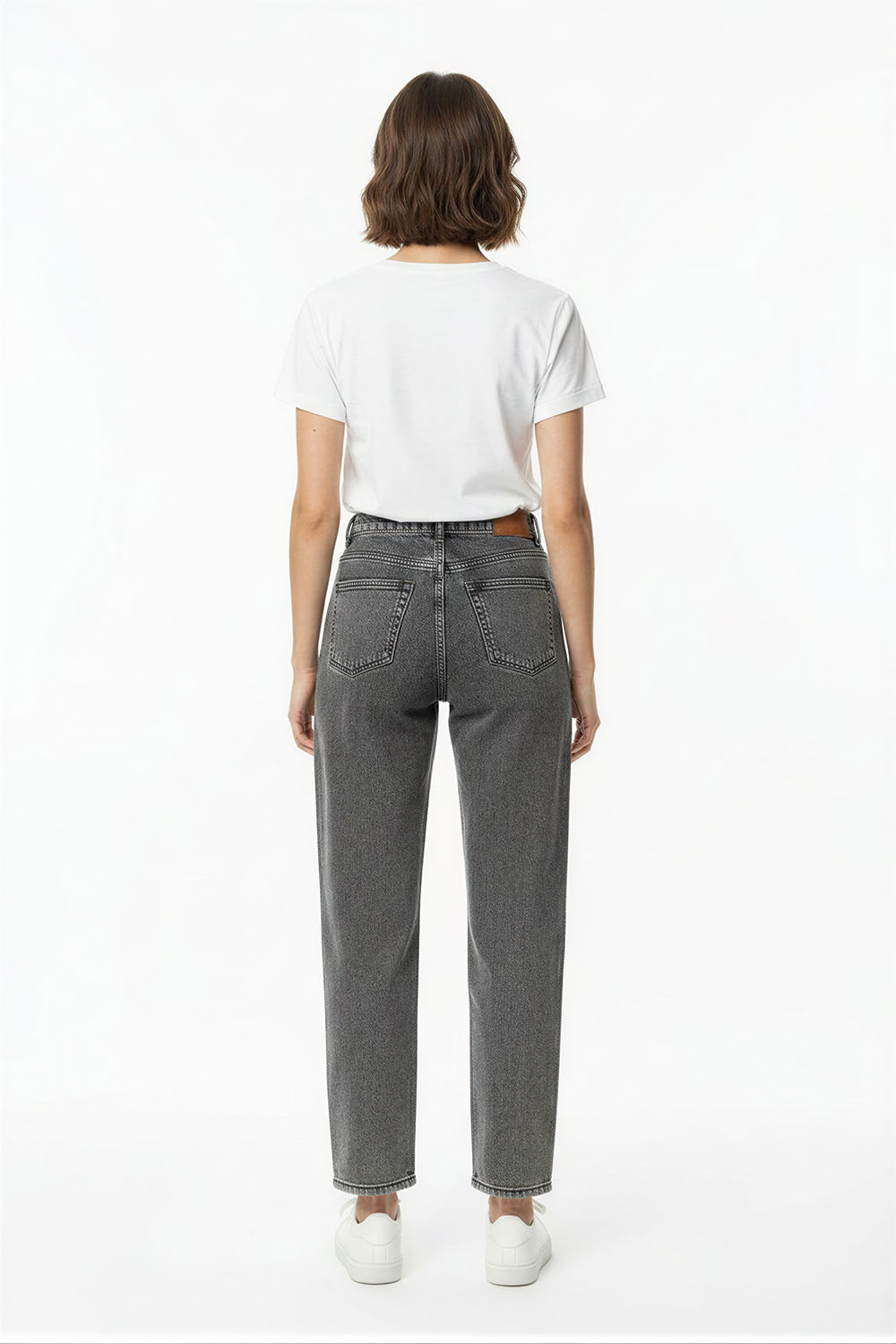 Jeans de tiro medio con pretina fija, cierre frontal, diseño de cinco bolsillos y estructura firme