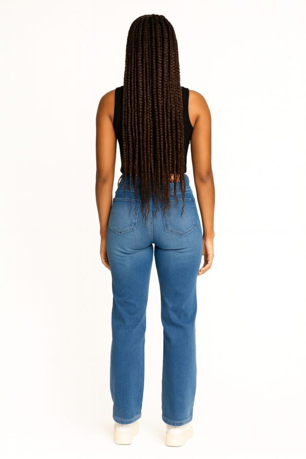 Jeans de tiro medio con corte recto que ofrece comodidad y estilo urbano, diseño con roturas al frente que aportan un toque moderno y desenfadado, bolsillos funcionales delanteros y traseros que brindan practicidad, cierre frontal con botón metálico y cierre de cremallera, confeccionados en mezclilla resistente con acabado suave al tacto que permite libertad de movimiento