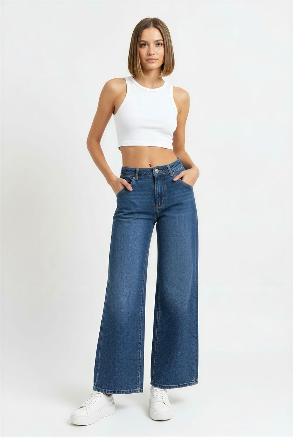 Jeans de tiro alto con cierre frontal y botón metálico que brinda ajuste seguro, corte wide leg con pierna amplia que permite libertad de movimiento, diseño de cinco bolsas funcionales que aportan practicidad, confección en mezclilla resistente que ofrece durabilidad, pretina estructurada que mejora el ajuste en cintura