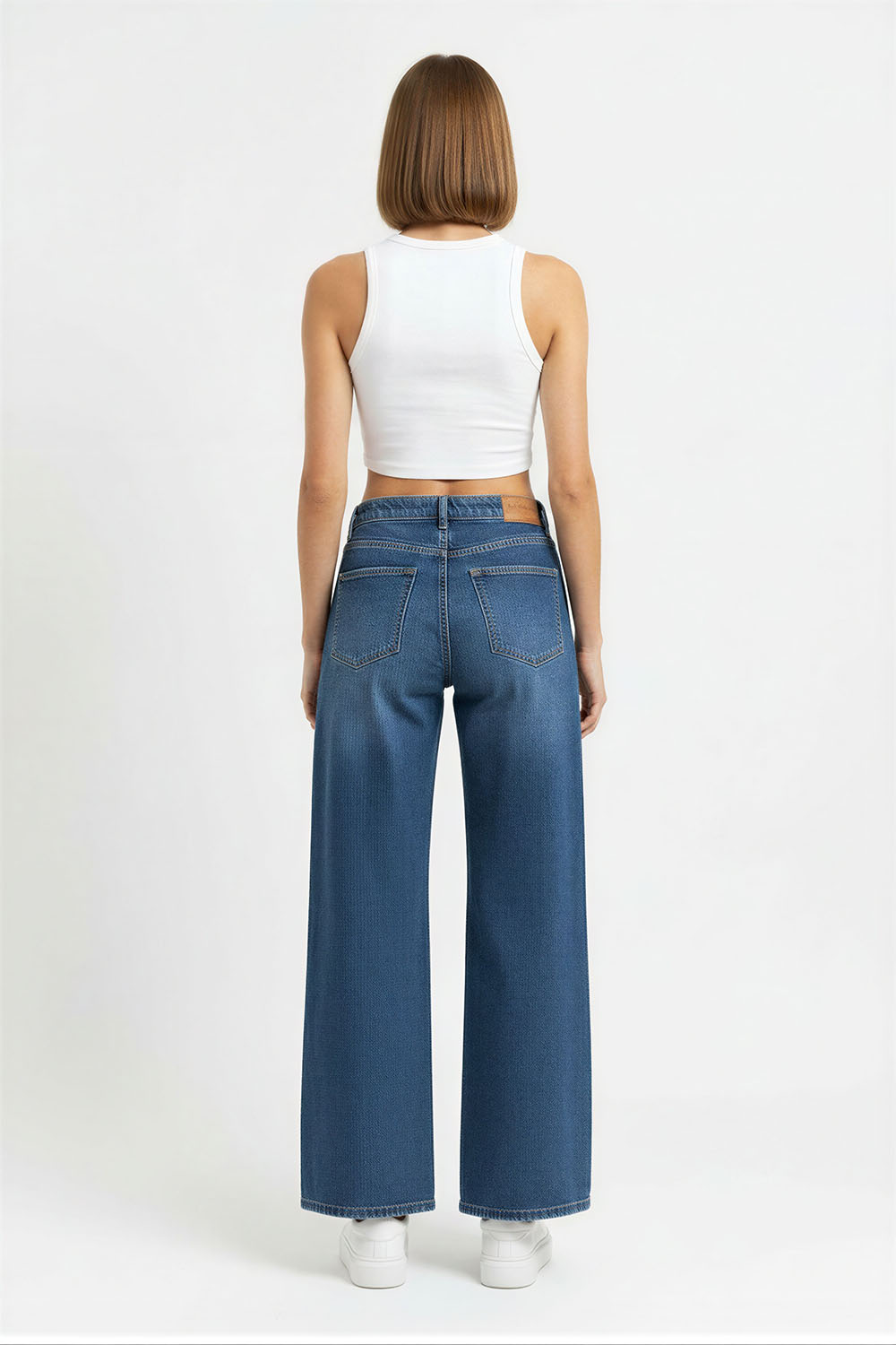 Jeans de tiro alto con corte wide leg que aporta amplitud y comodidad, diseño con pretina firme y cierre frontal que brinda ajuste seguro, estructura rígida que mantiene la forma de la prenda, largo completo que estiliza la figura y permite versatilidad en uso diario