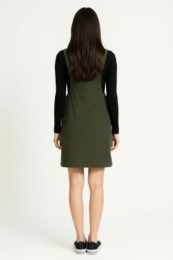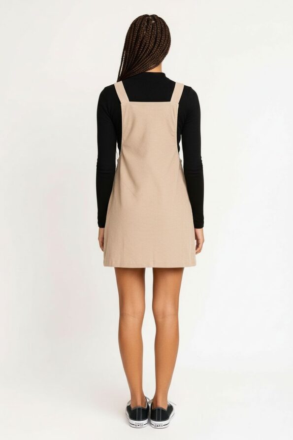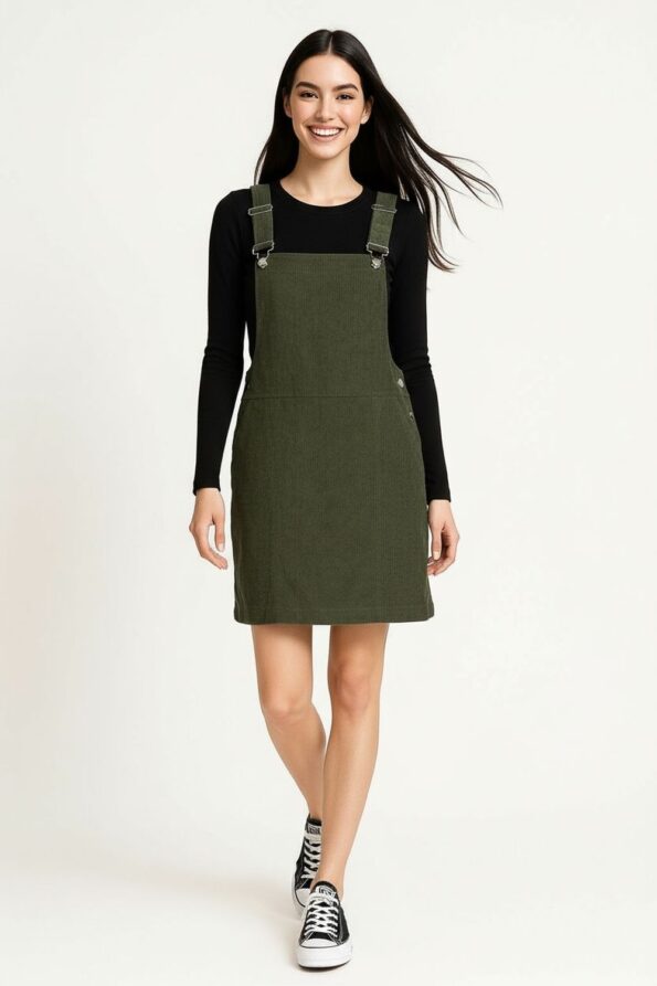 Jumper corto confeccionado en tela tipo pana con textura acanalada que aporta un toque vintage y moderno, tirantes ajustables con hebillas metálicas que permiten personalizar el ajuste, corte recto que se adapta al cuerpo de forma cómoda, bolsillos laterales funcionales que añaden practicidad y estilo casual