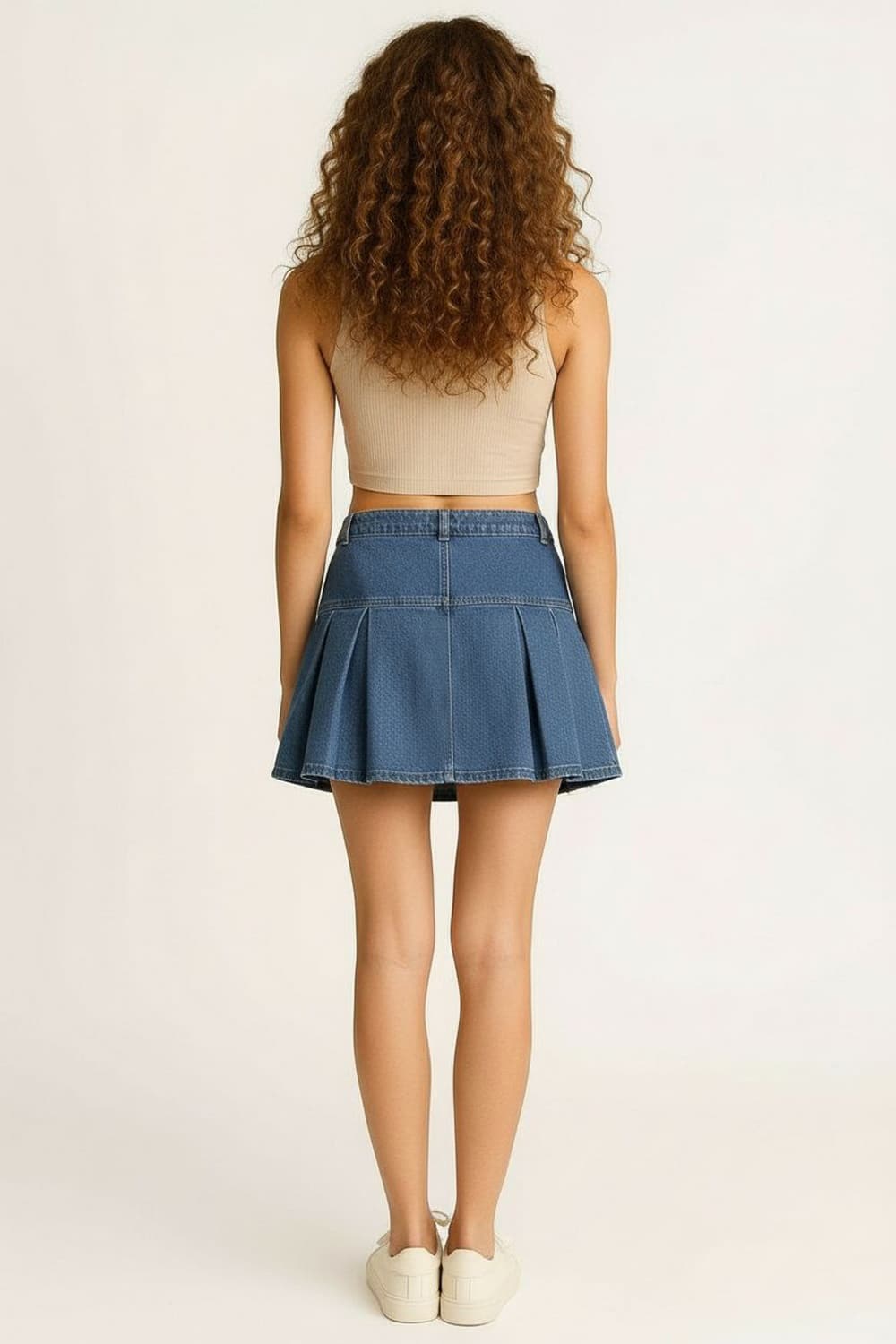 Falda corta de tiro alto con pretina ancha y botonadura frontal metálica que aporta detalle distintivo, diseño con tapas decorativas al frente que añaden estructura, corte mini con tablas marcadas que brindan movimiento, confección en mezclilla firme de textura resistente que mantiene la forma, ajuste definido en cintura con caída ligera hacia el bajo