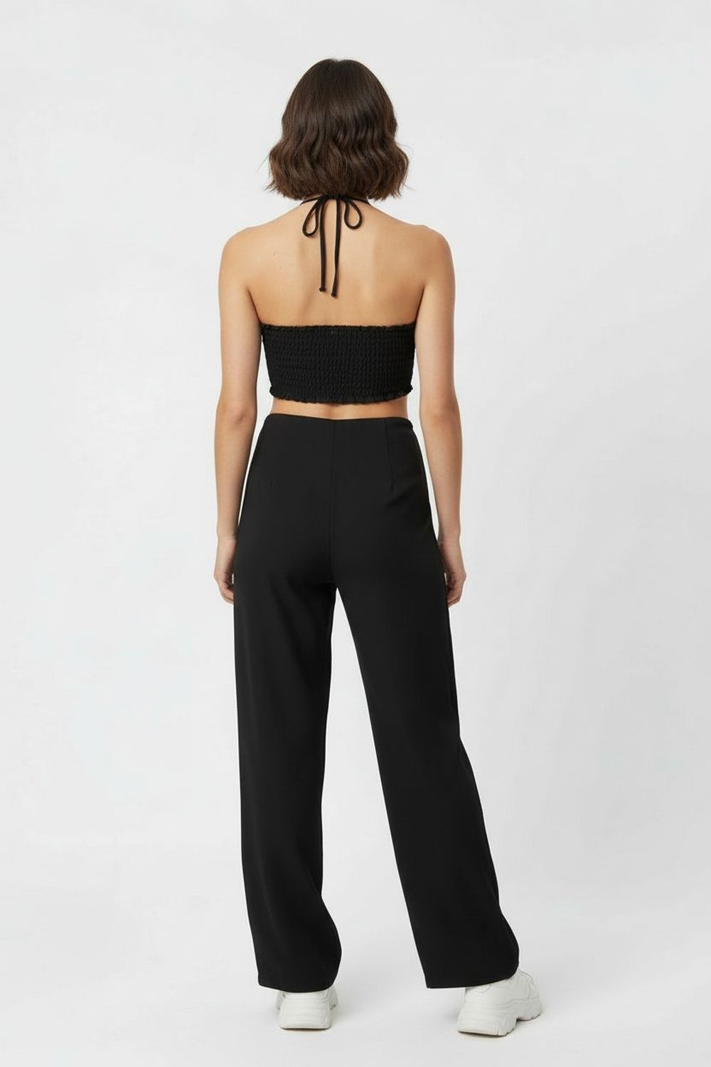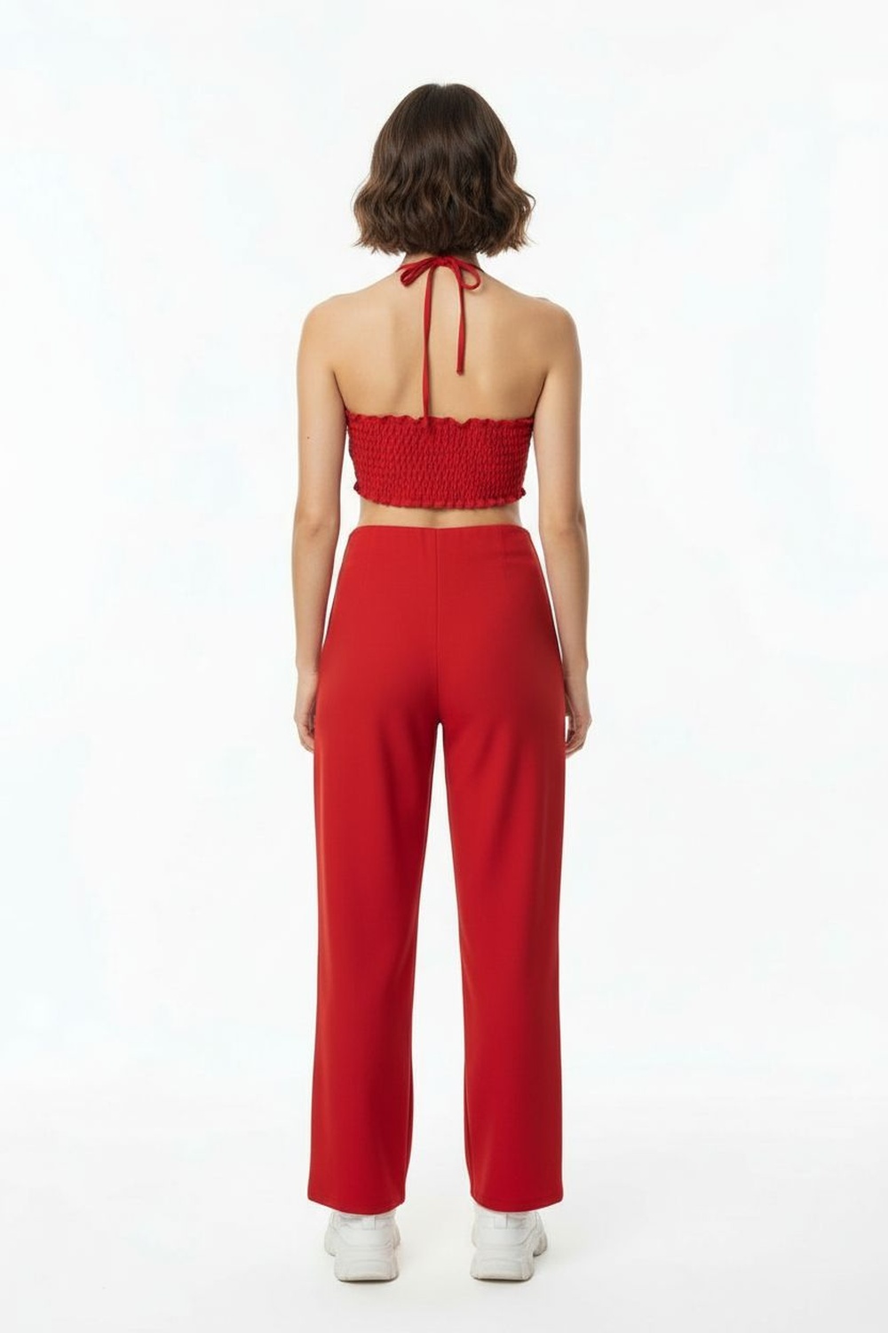 Palazzo de tirantes delgados con copas integradas que brindan soporte ligero al busto, escote recto con estructura interna para mejor ajuste, pierna amplia con caída fluida que aporta comodidad al caminar, largo midi que estiliza la figura, confección en tejido suave de tacto agradable