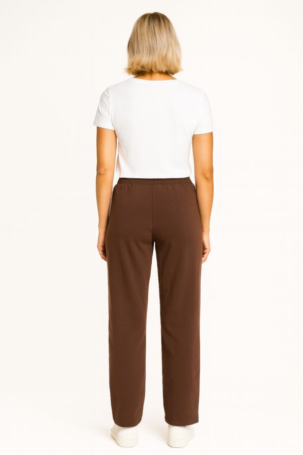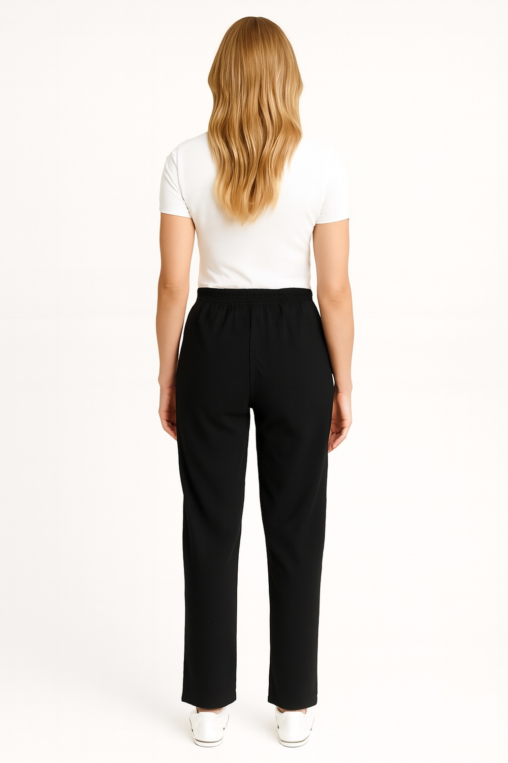 Pantalón de corte recto con pretina al contraste que aporta un detalle distintivo, tiro medio que asegura ajuste favorecedor, bolsillos laterales funcionales que brindan practicidad, confección en tejido suave con caída ligera que ofrece comodidad y movilidad, costuras reforzadas que garantizan durabilidad