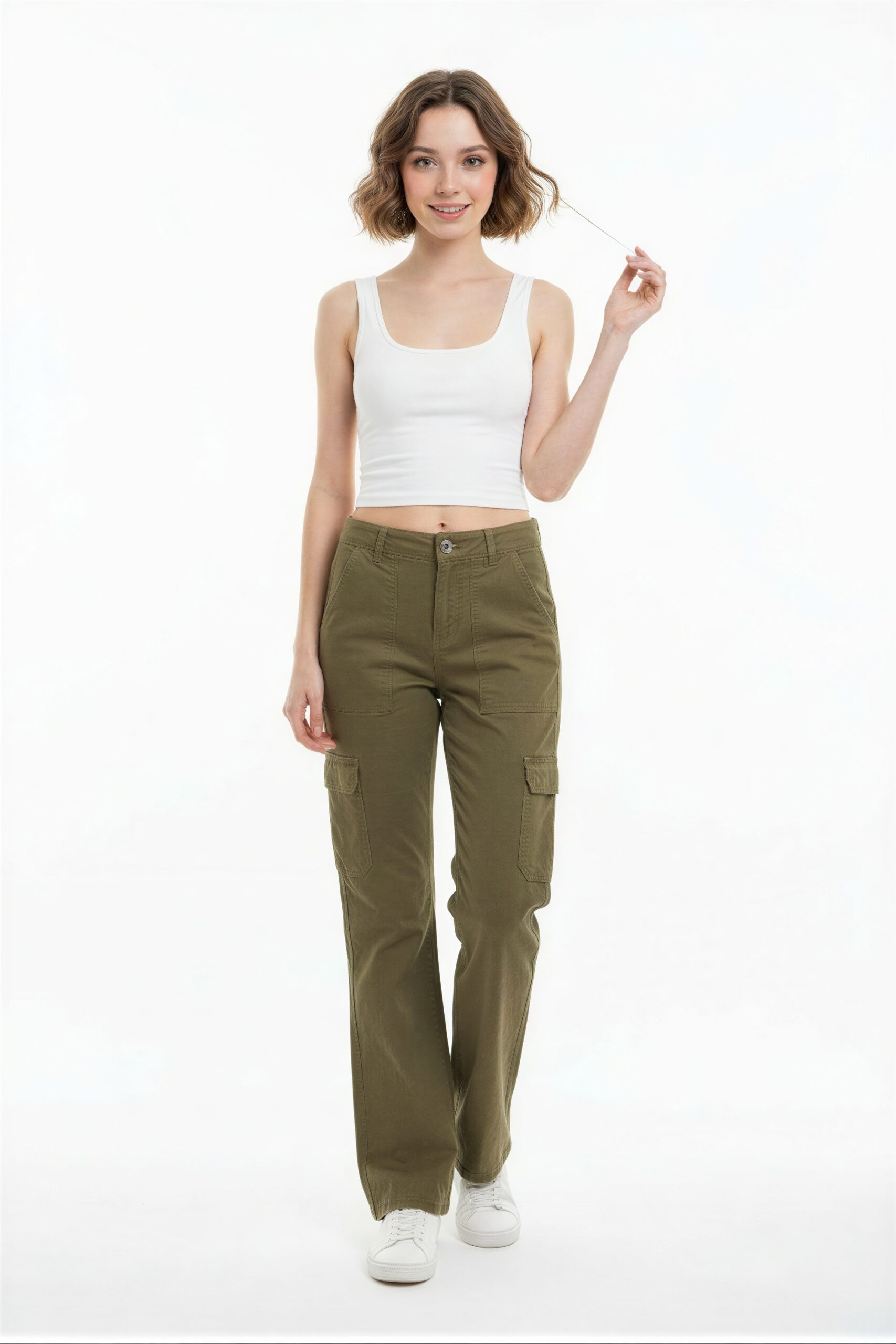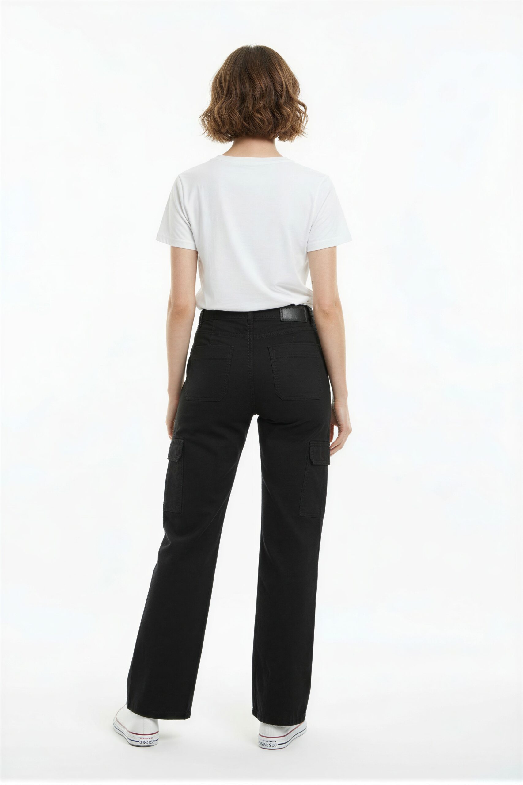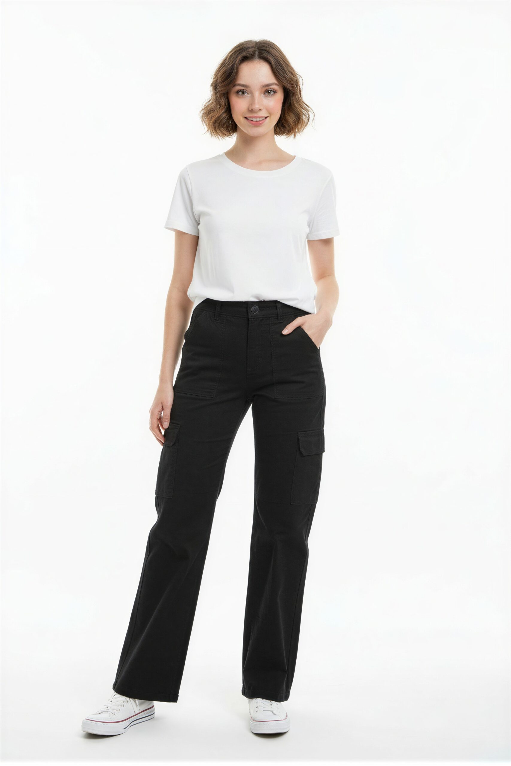 Pantalón de tiro medio, corte amplio, cierre frontal con botón y cierre, bolsas laterales tipo cargo, estructura resistente, ajuste cómodo
