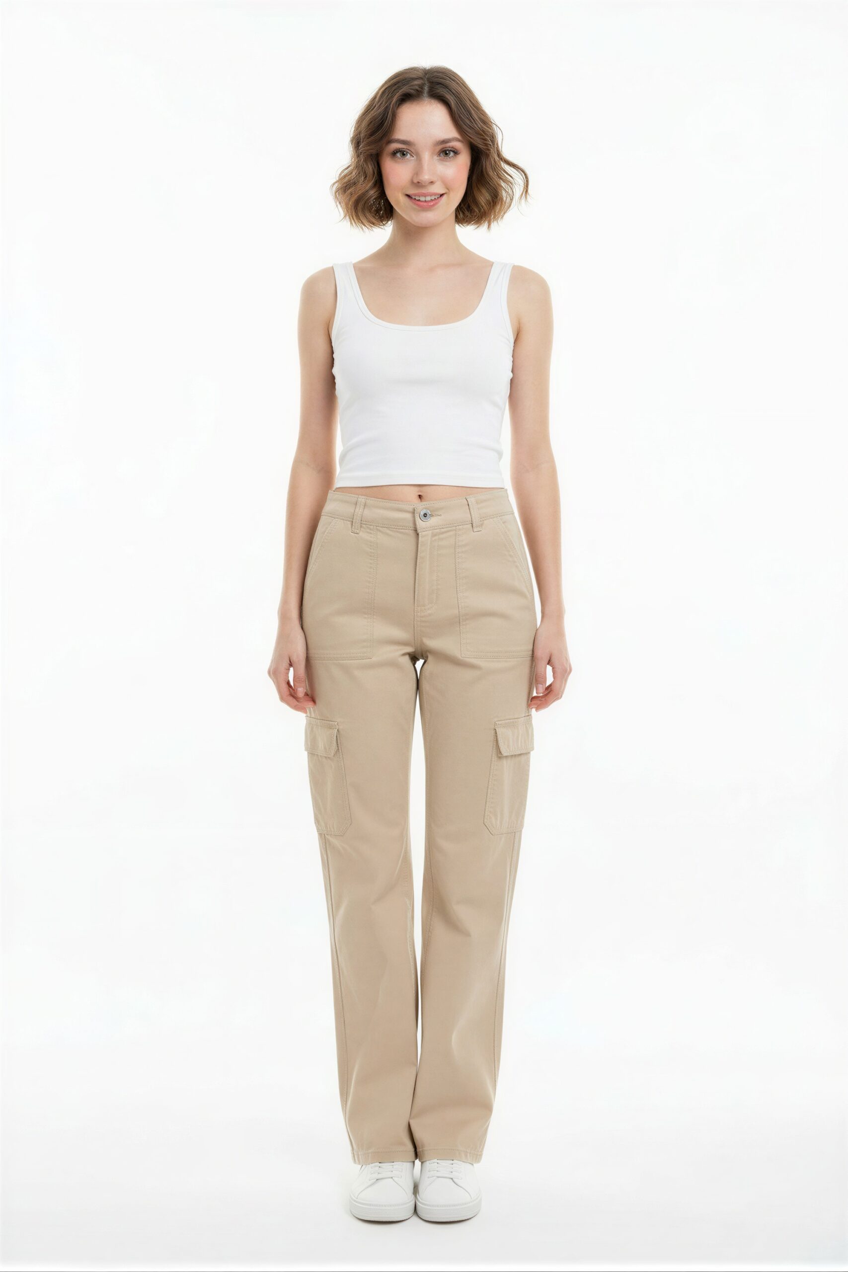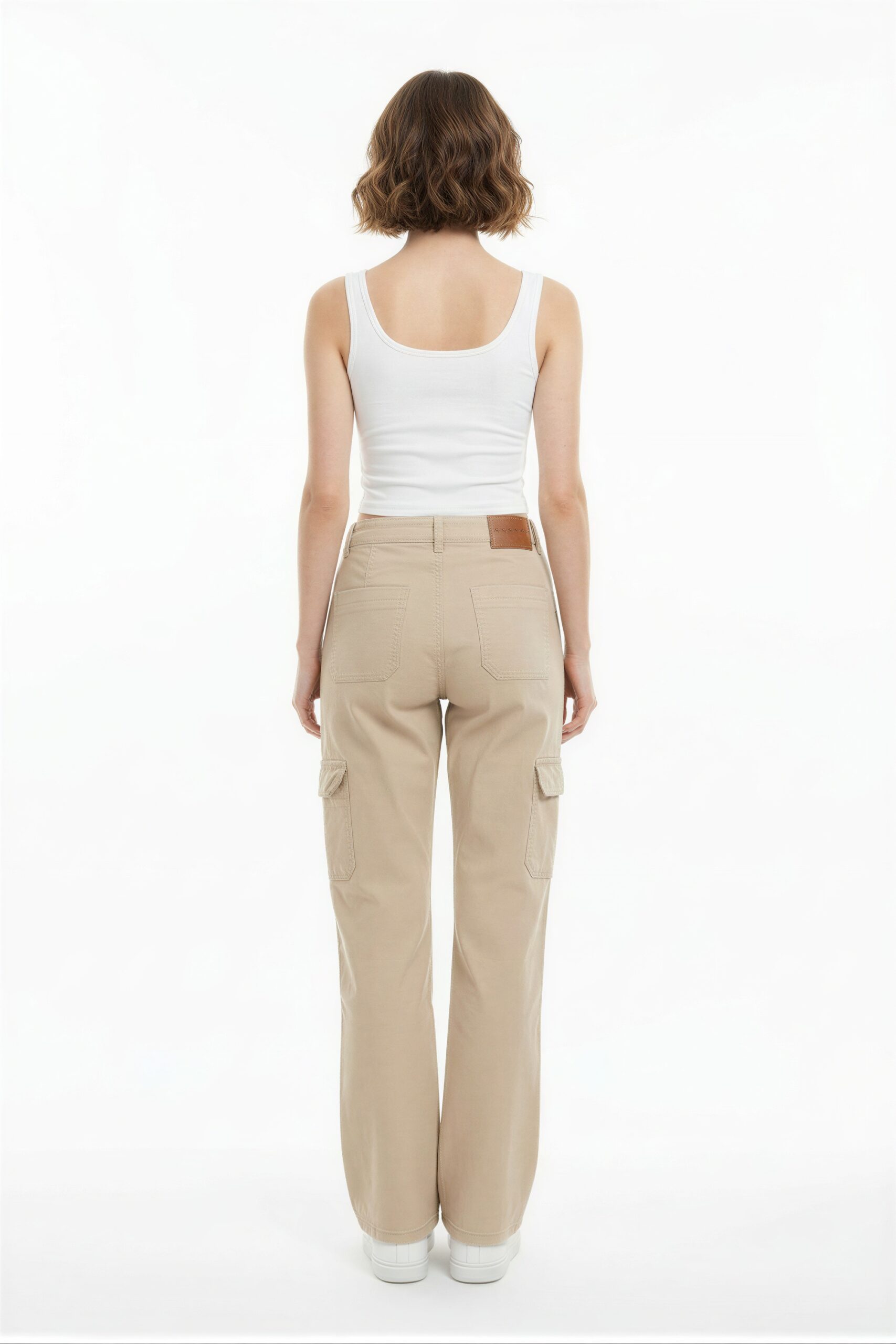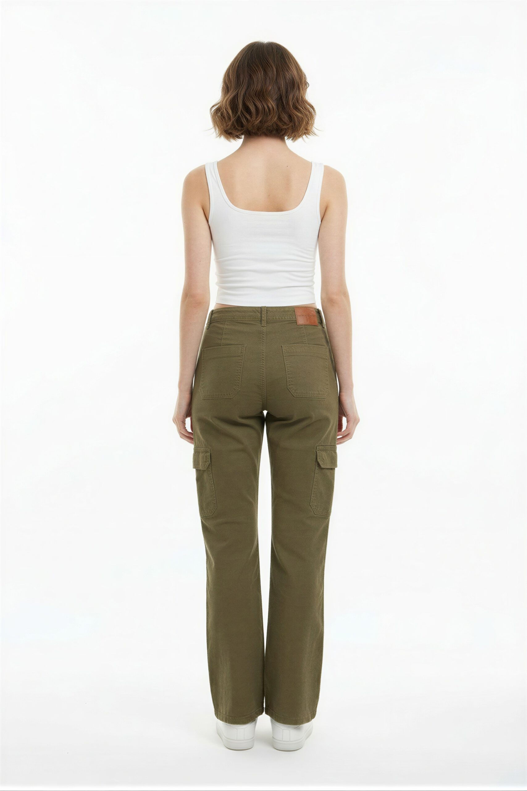 Pantalón de tiro medio, corte amplio, cierre frontal con botón y cierre, bolsas laterales tipo cargo, estructura resistente, ajuste cómodo