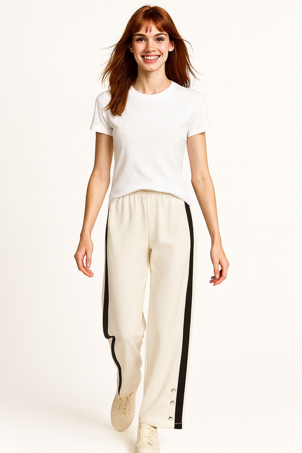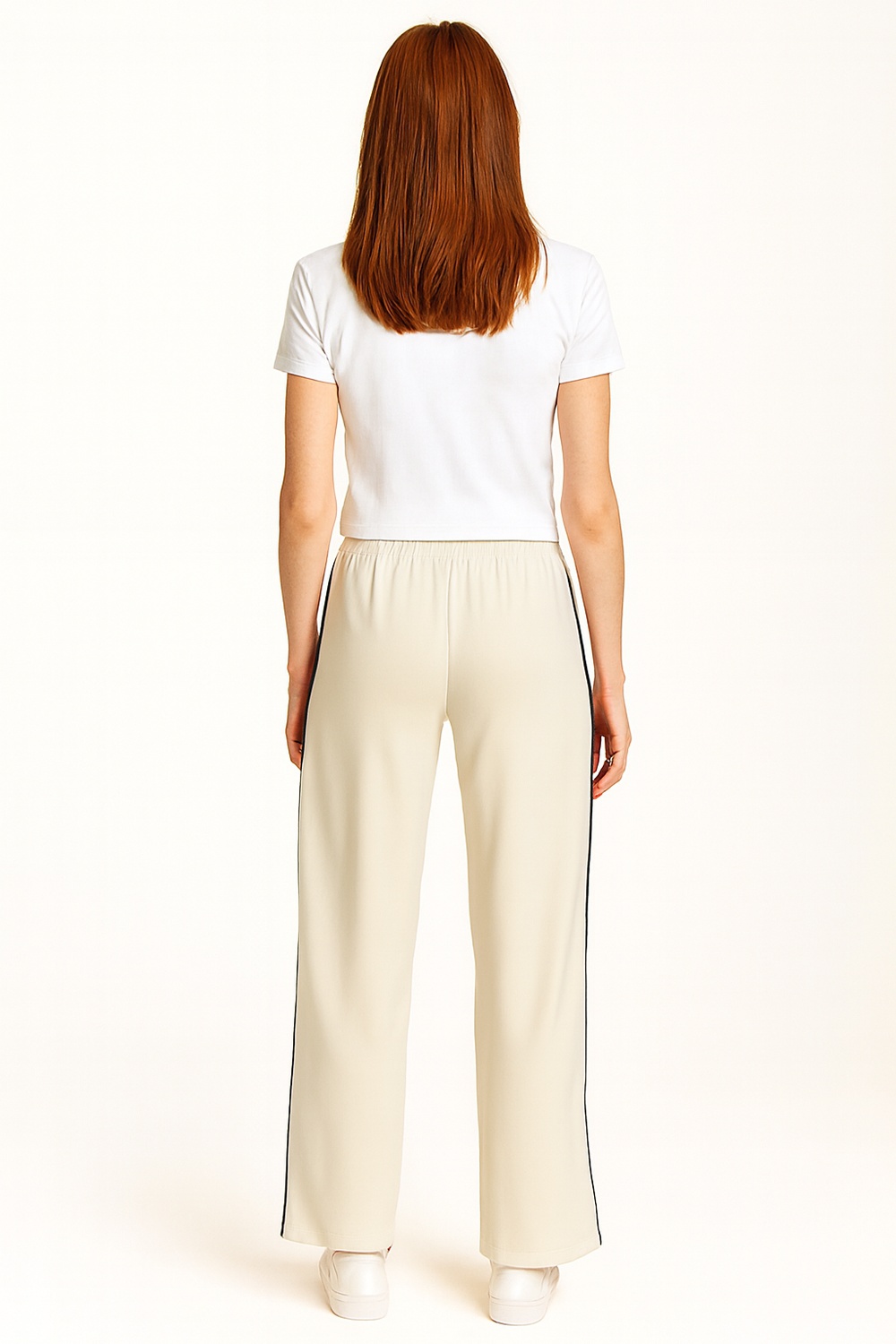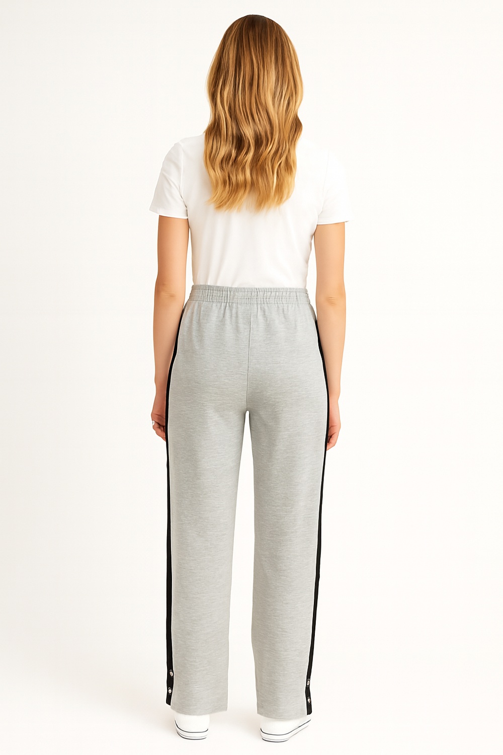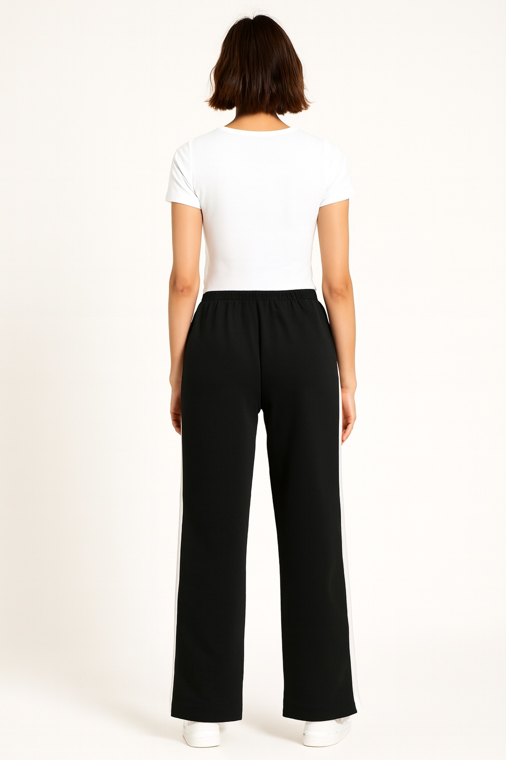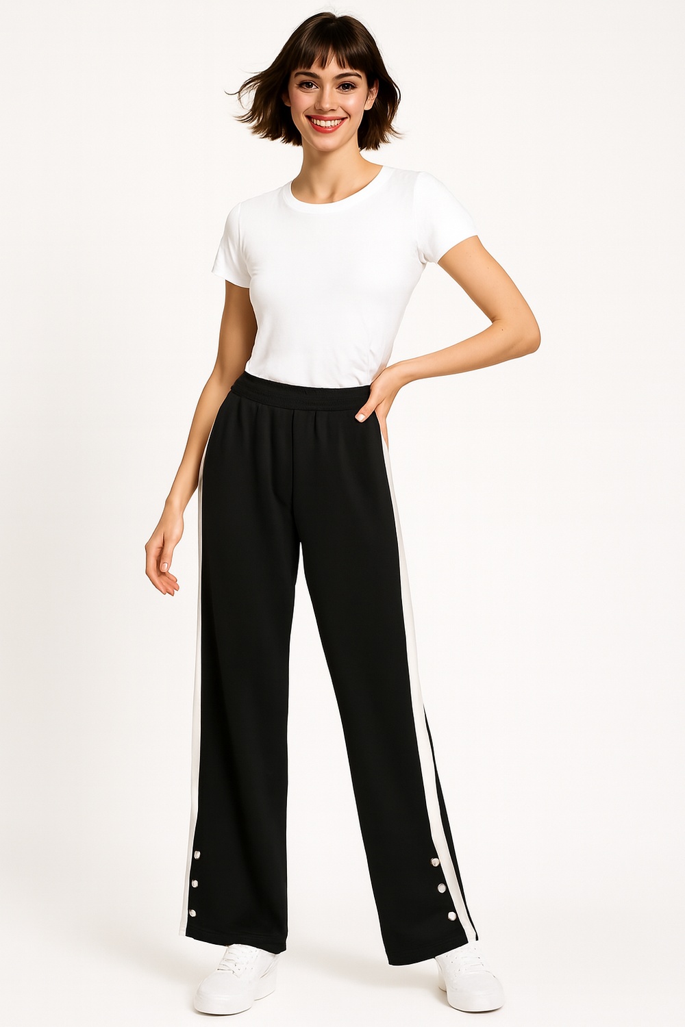 Pantalón de corte amplio con pretina elástica que ofrece ajuste seguro, detalle de bies contrastante en laterales que estiliza visualmente la figura, terminado con botones decorativos en el bajo y confección en tejido suave de caída fluida