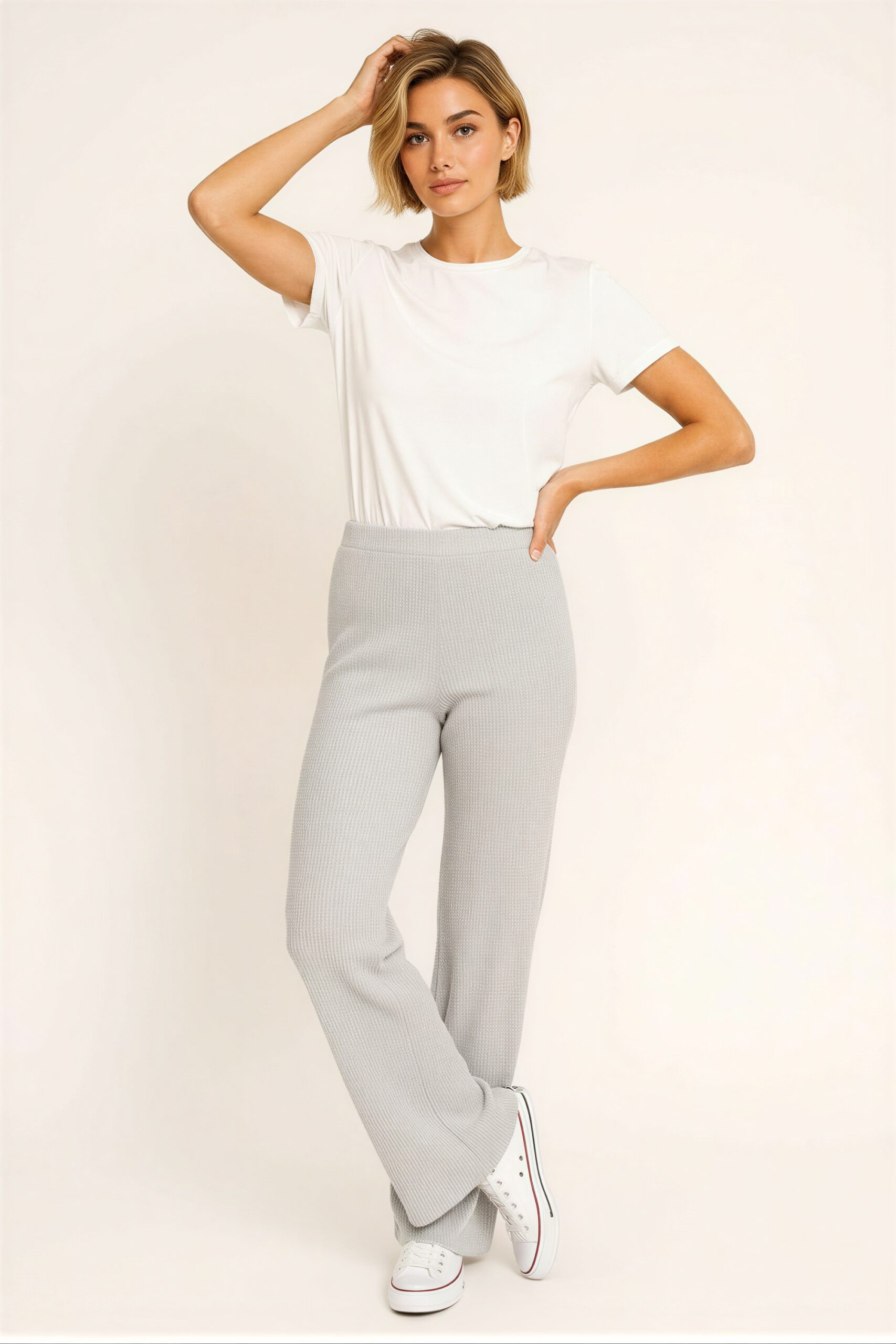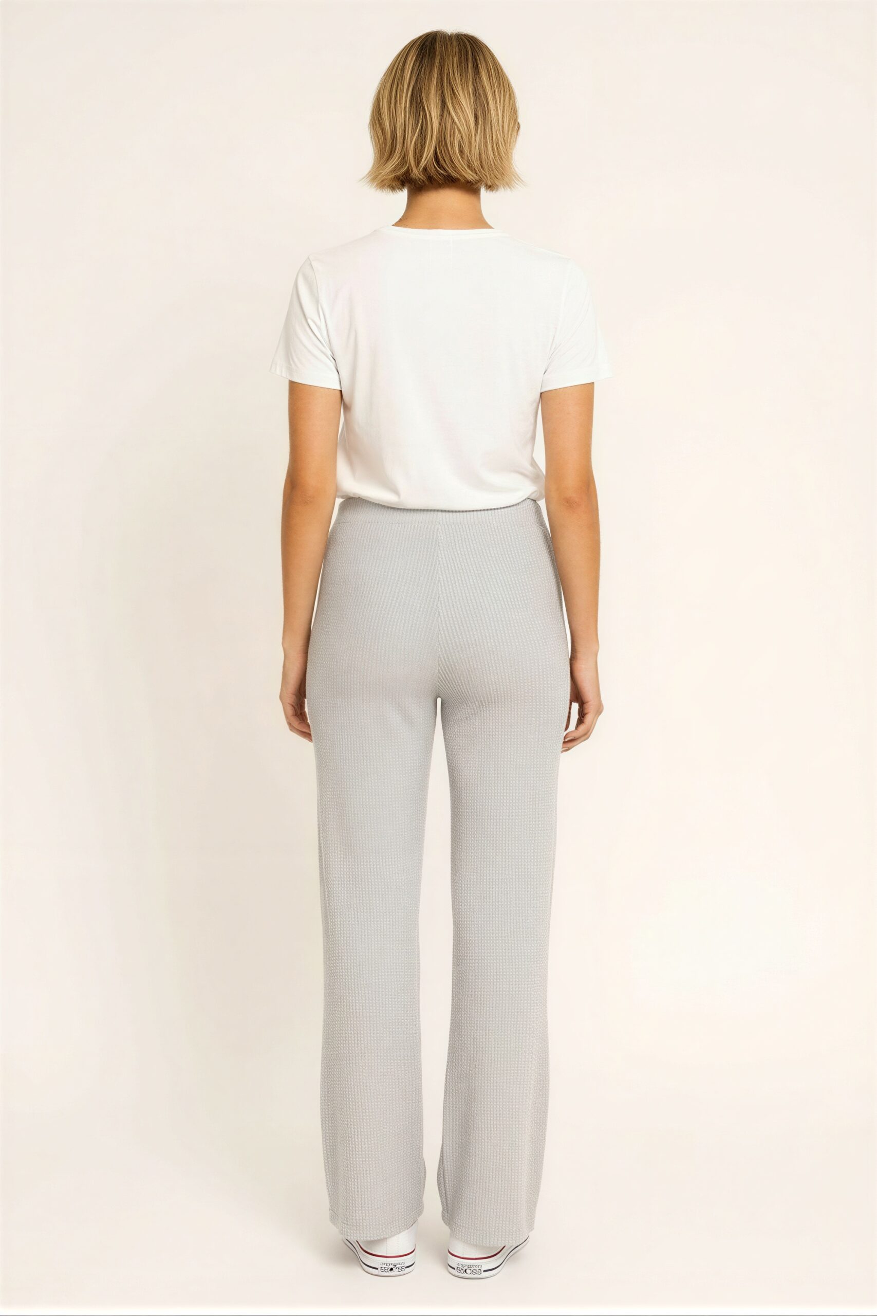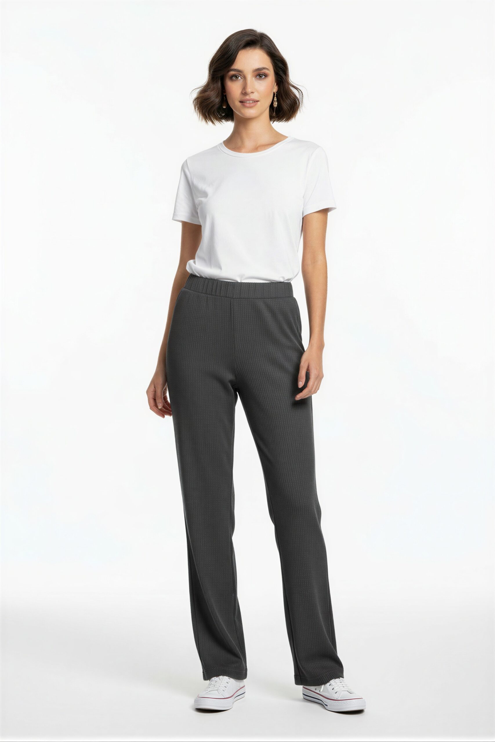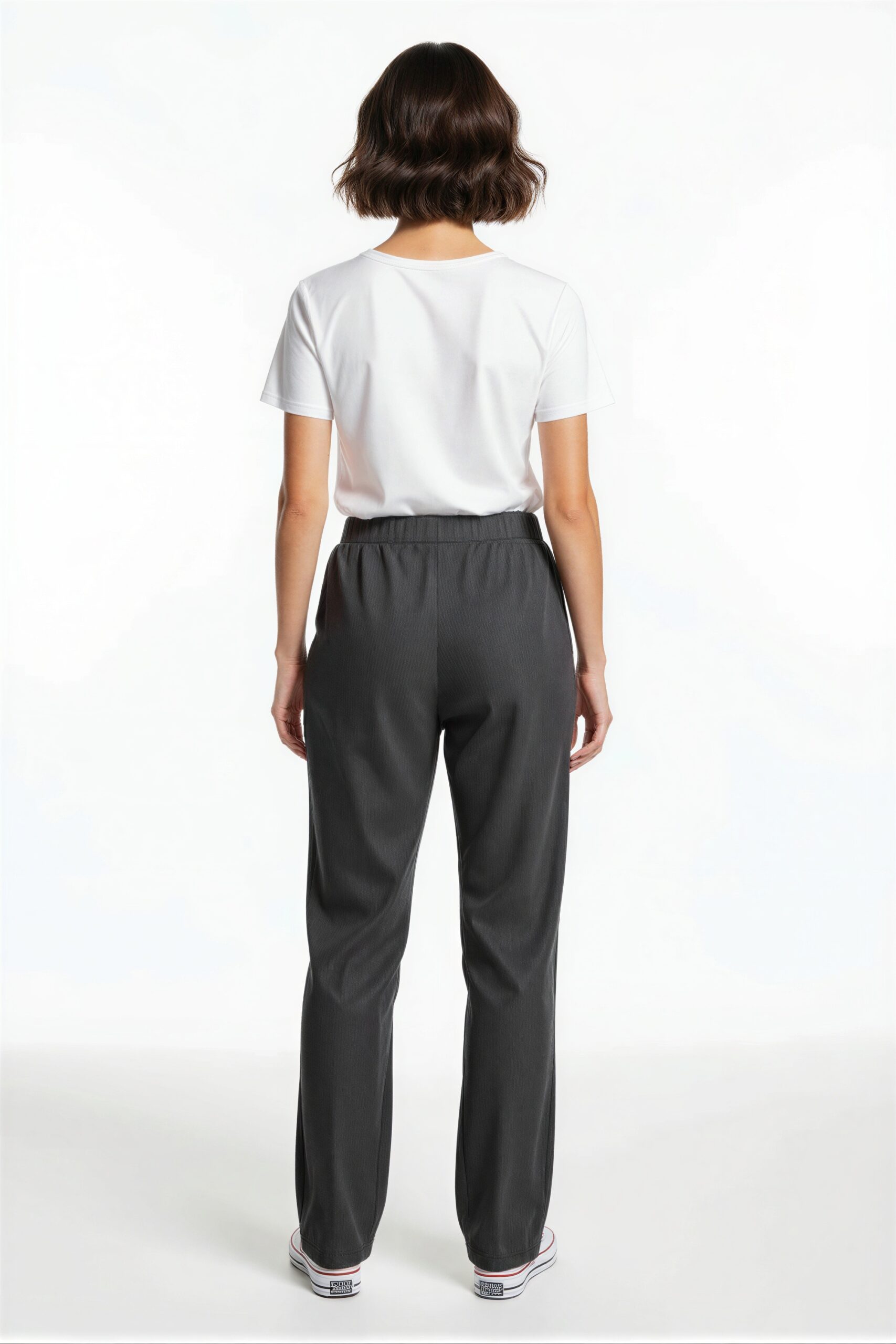 Pantalón con pretina elástica, ajuste cómodo en cintura, bolsillos laterales funcionales, corte amplio en pierna con caída recta, confección suave que brinda libertad de movimiento