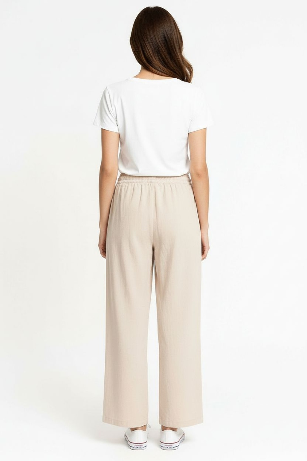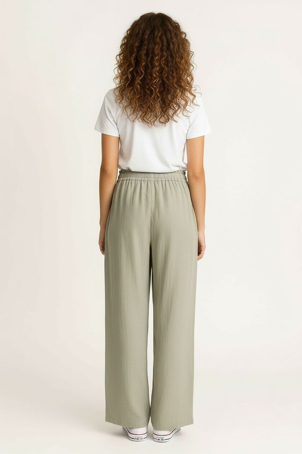 Pantalón de tiro medio con pretina elástica y jareta ajustable, corte amplio en pierna que permite movilidad, largo recto al tobillo con caída ligera, confección en tejido tipo lino de tacto fresco, acabado limpio con ajuste relajado