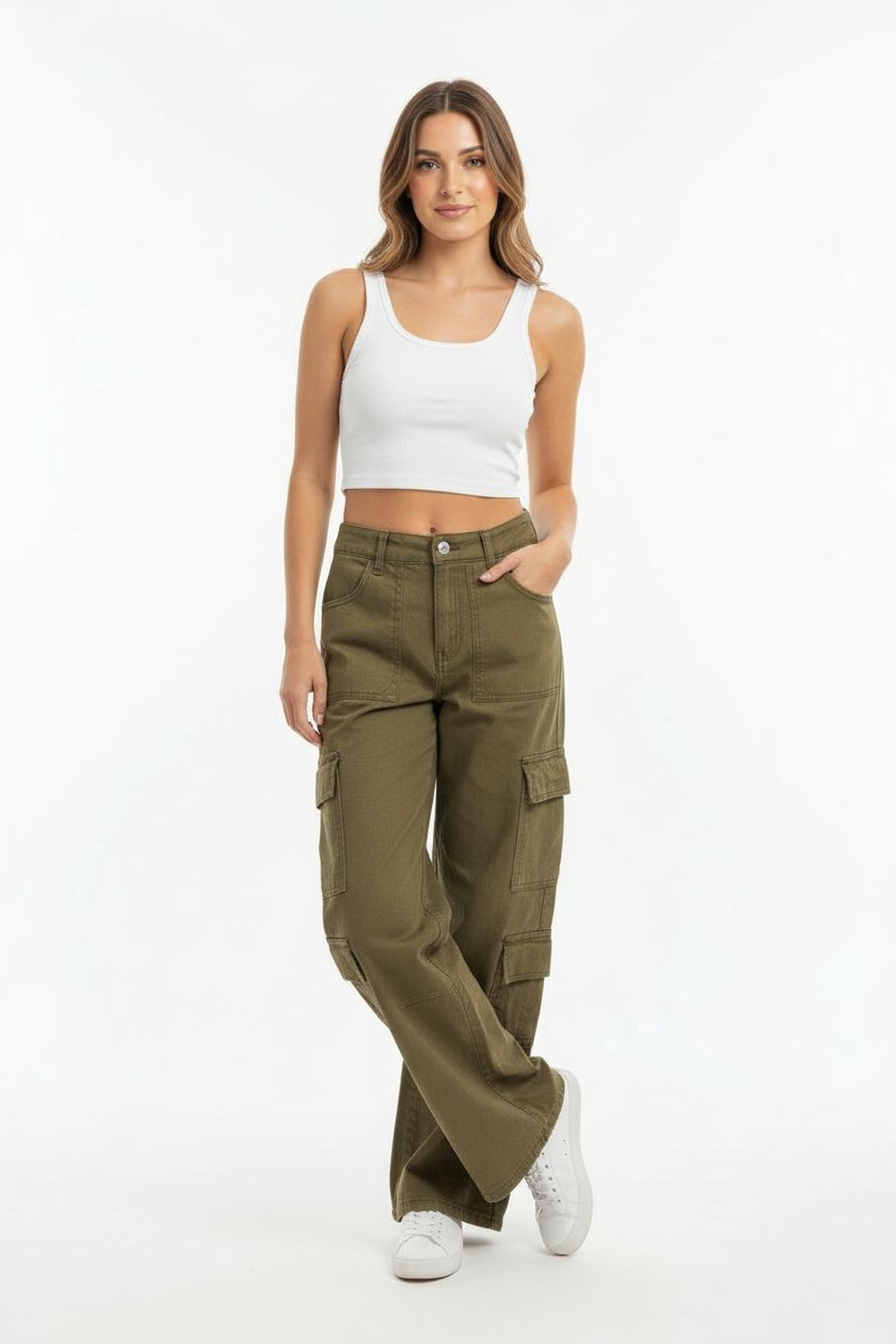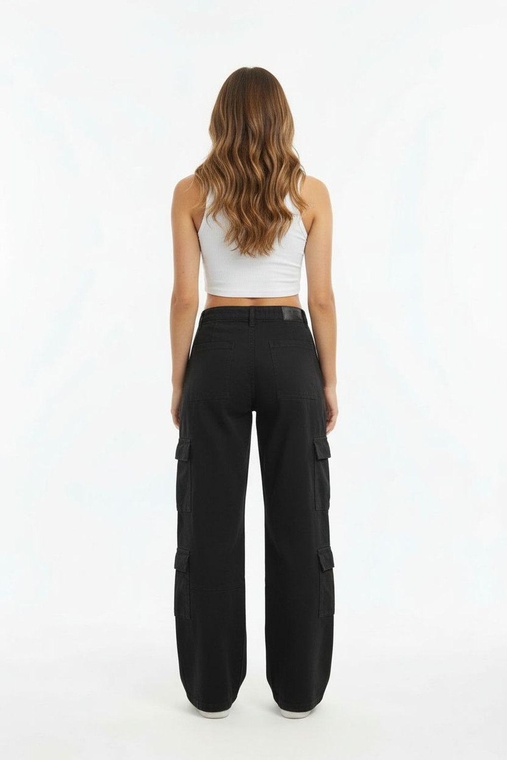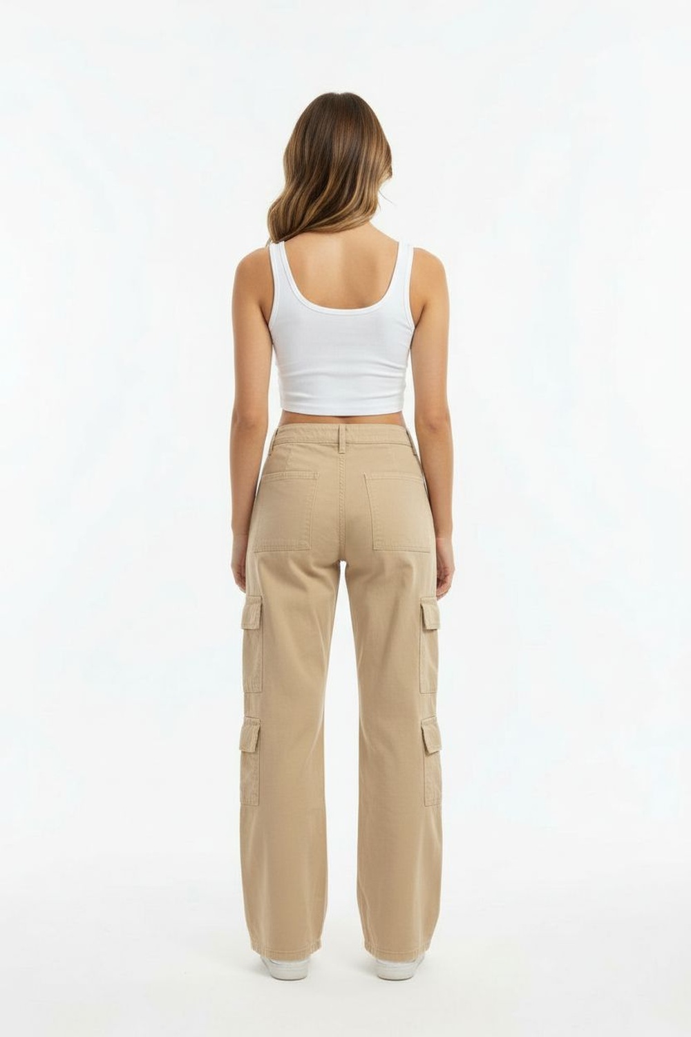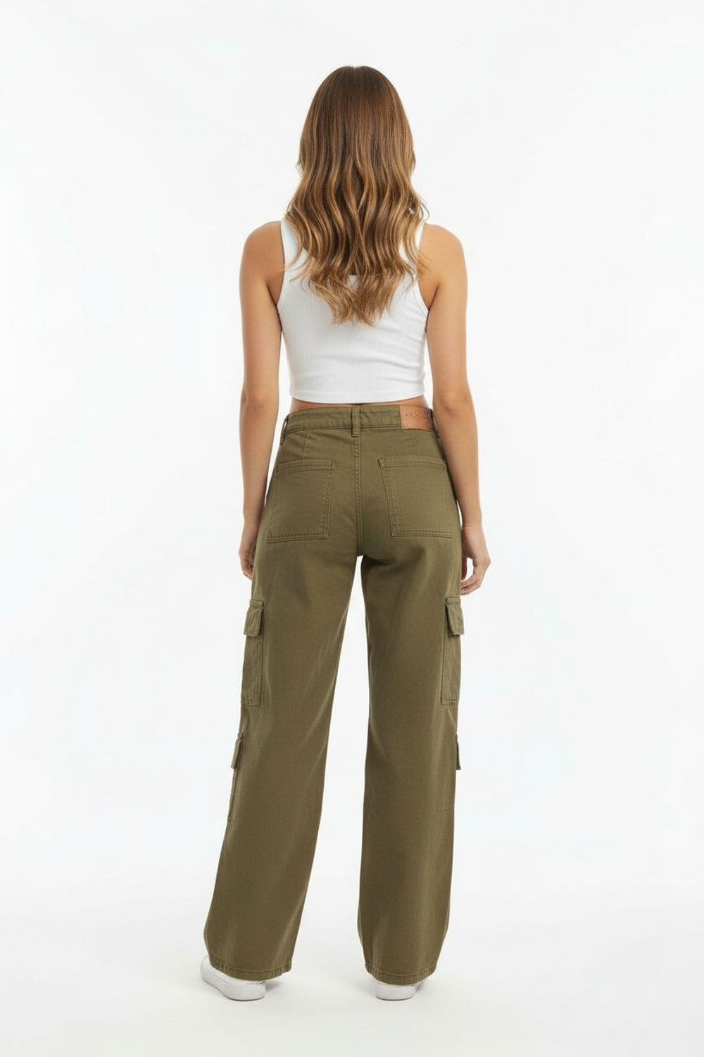 Pantalón cargo de tiro medio, corte recto con ajuste cómodo, bolsillos laterales funcionales, cierre frontal con botón y cierre, estructura resistente con caída recta