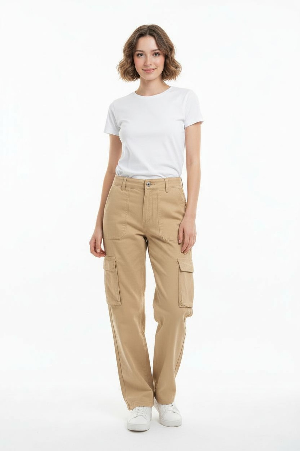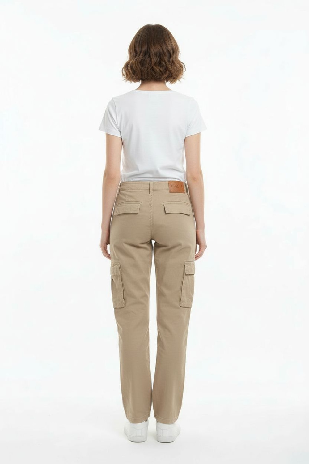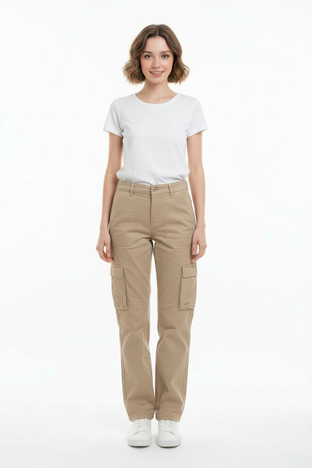 Pantalón tipo cargo de tiro medio, cierre frontal con botón, bolsillos laterales y tipo parche en piernas, corte recto con caída natural y estructura resistente