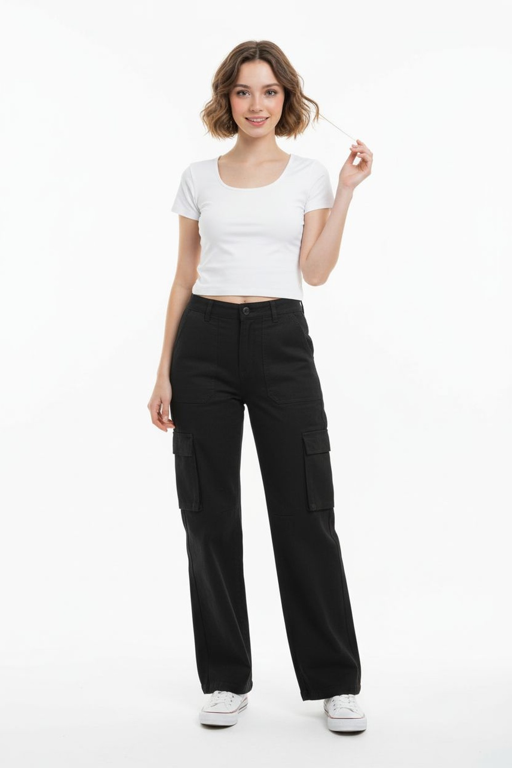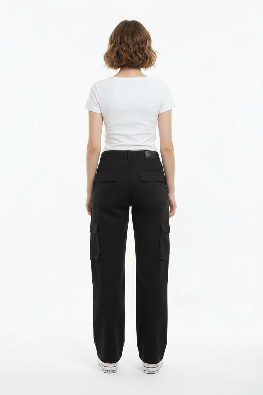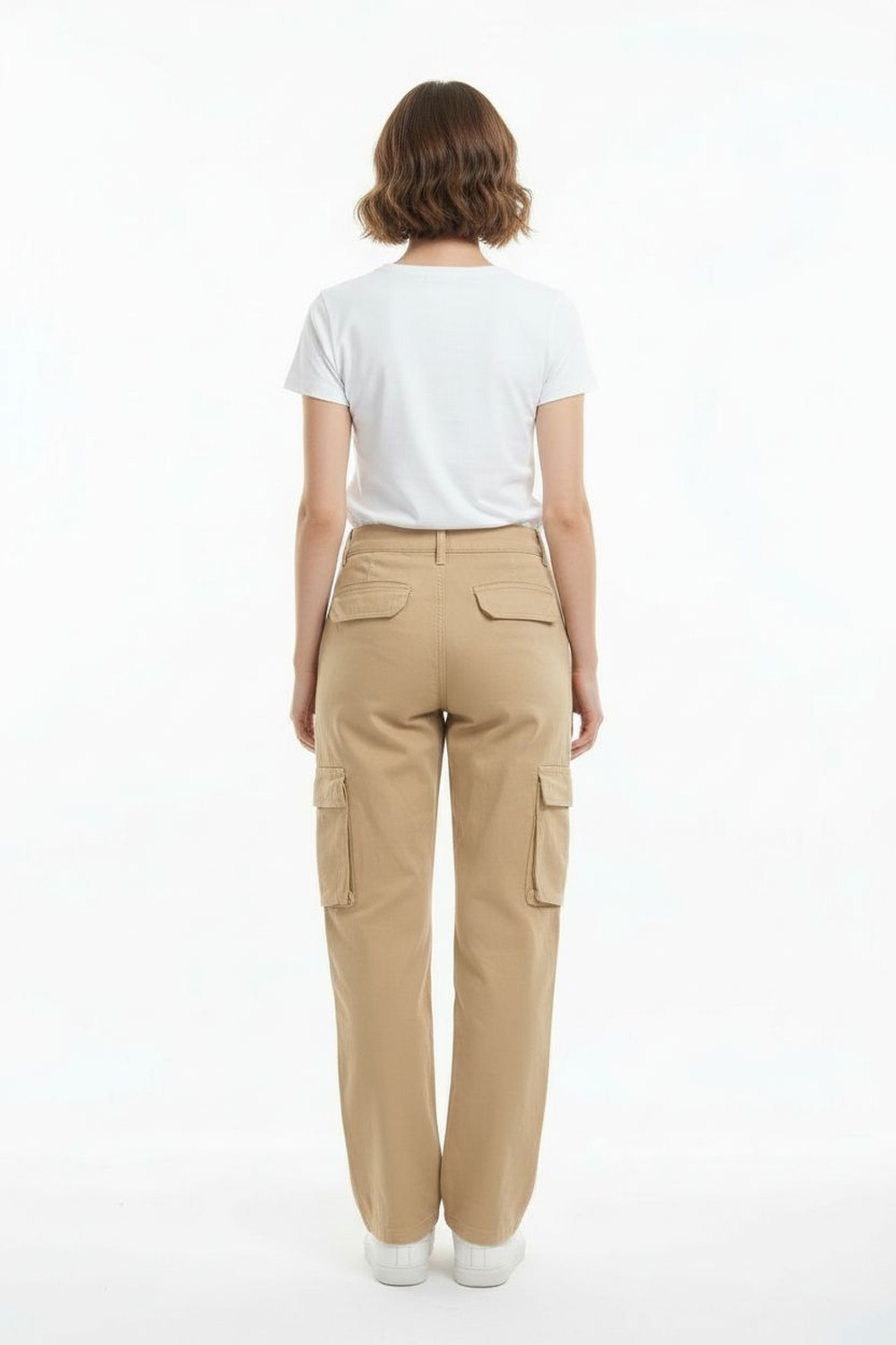 Pantalón tipo cargo de tiro medio, cierre frontal con botón, bolsillos laterales y tipo parche en piernas, corte recto con caída natural y estructura resistente