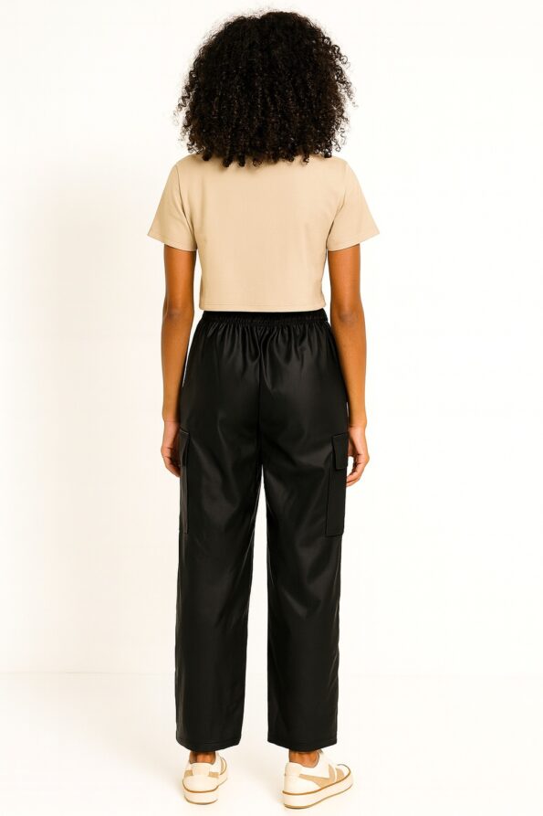 Pantalón cargo de tiro medio con pretina elástica y jareta ajustable que brindan comodidad, bolsillos laterales amplios con tapa que aportan practicidad y estilo, confección en tela de acabado grueso que asegura durabilidad y confort, corte recto que favorece la silueta, ideal para looks urbanos y combinaciones modernas de temporada