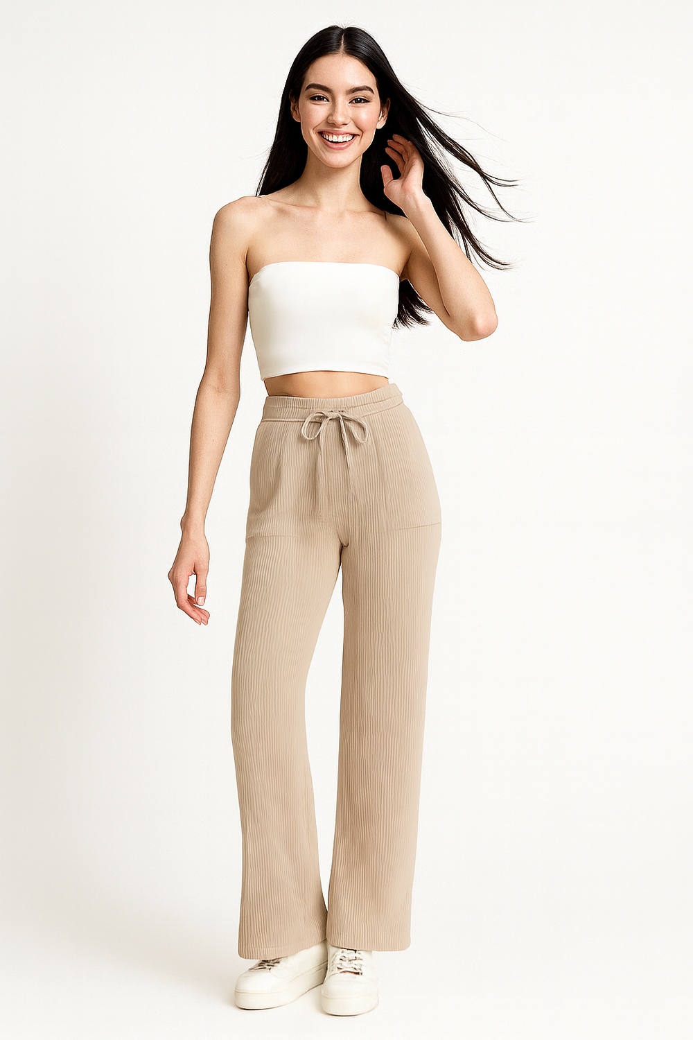 Pantalón de corte amplio con cintura elástica y jareta ajustable que brinda mayor comodidad, diseño tipo cargo con bolsillos funcionales que aportan practicidad, pierna recta con largo al tobillo que ofrece caída relajada, confección en tejido suave con textura acanalada que permite libertad de movimiento y ajuste cómodo durante todo el día