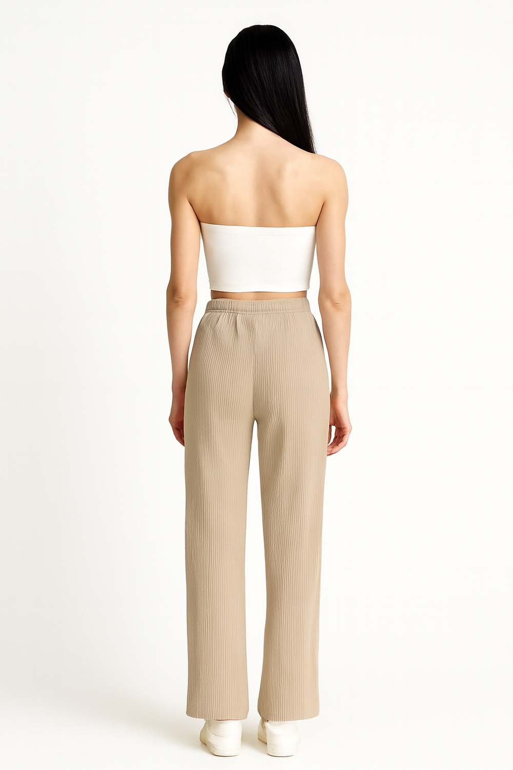 Conjunto de crepón con top sin mangas de escote en V y jareta frontal ajustable, corte ligeramente entallado que estiliza la parte superior, pantalón de tiro medio con pretina cómoda y pierna recta de caída amplia, textura ligera con acabado arrugado que aporta frescura y versatilidad