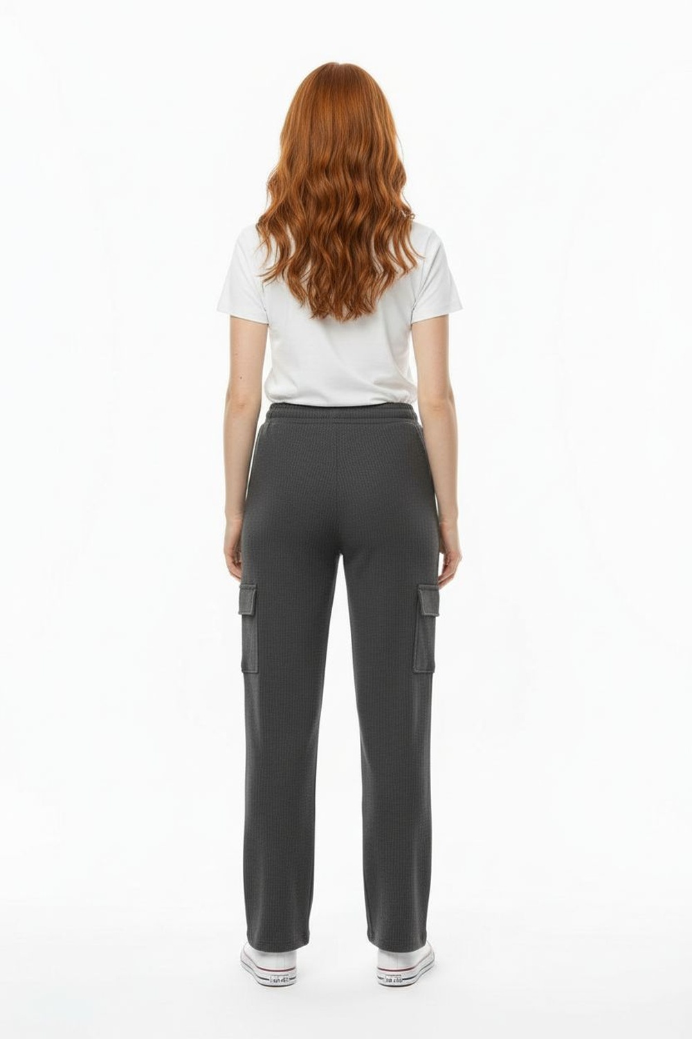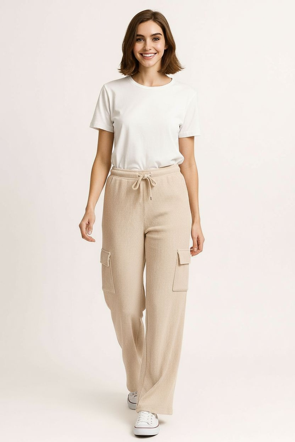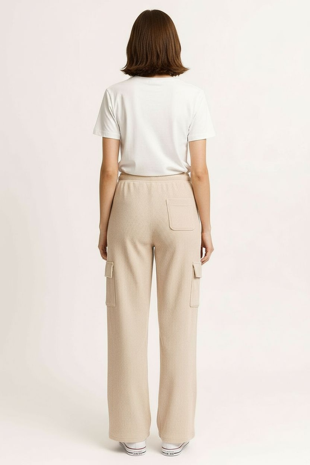 Pantalón de corte amplio con cintura elástica y jareta ajustable que brinda mayor comodidad, diseño tipo cargo con bolsillos funcionales que aportan practicidad, pierna recta con largo al tobillo que ofrece caída relajada, confección en tejido suave con textura acanalada que permite libertad de movimiento y ajuste cómodo durante todo el día