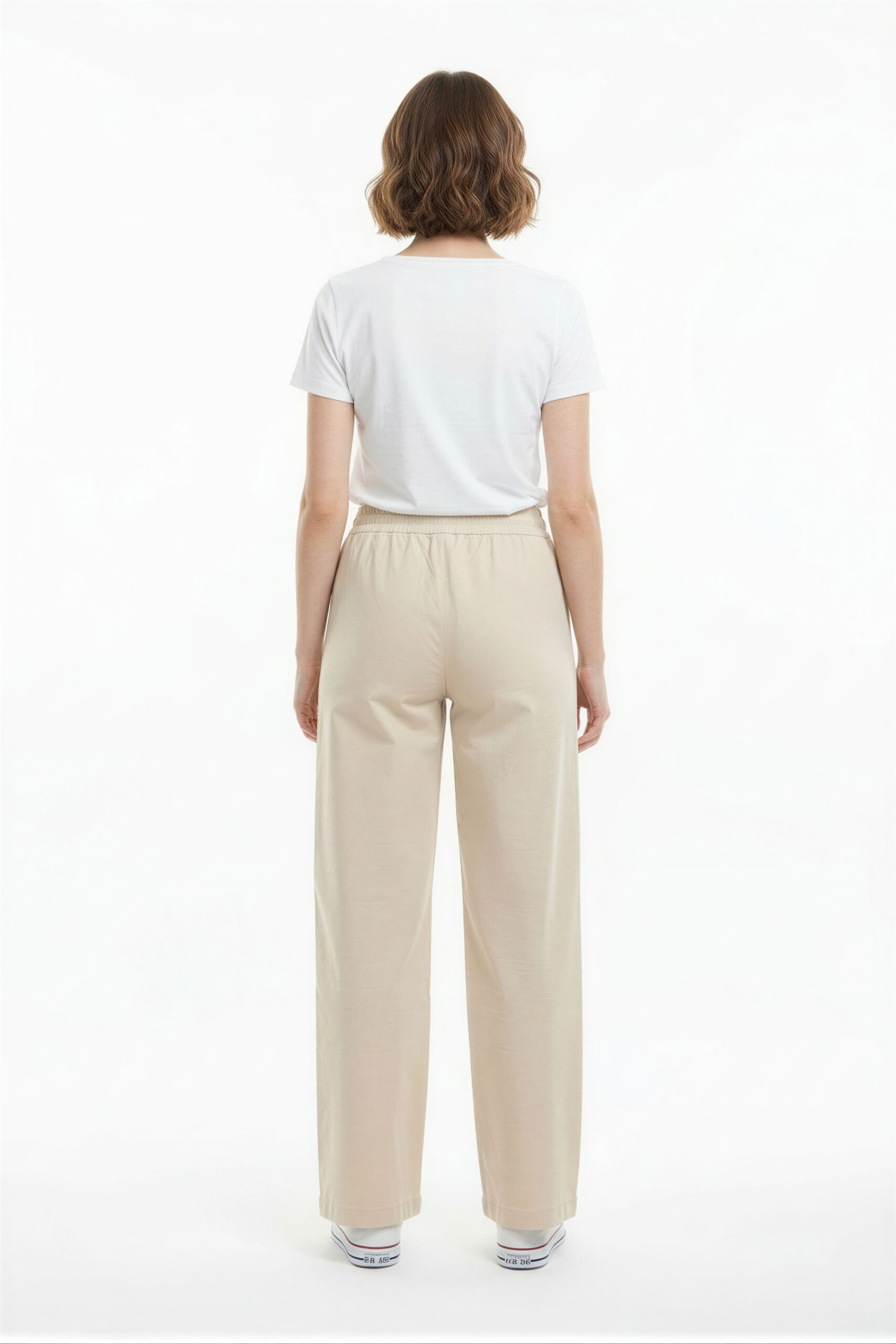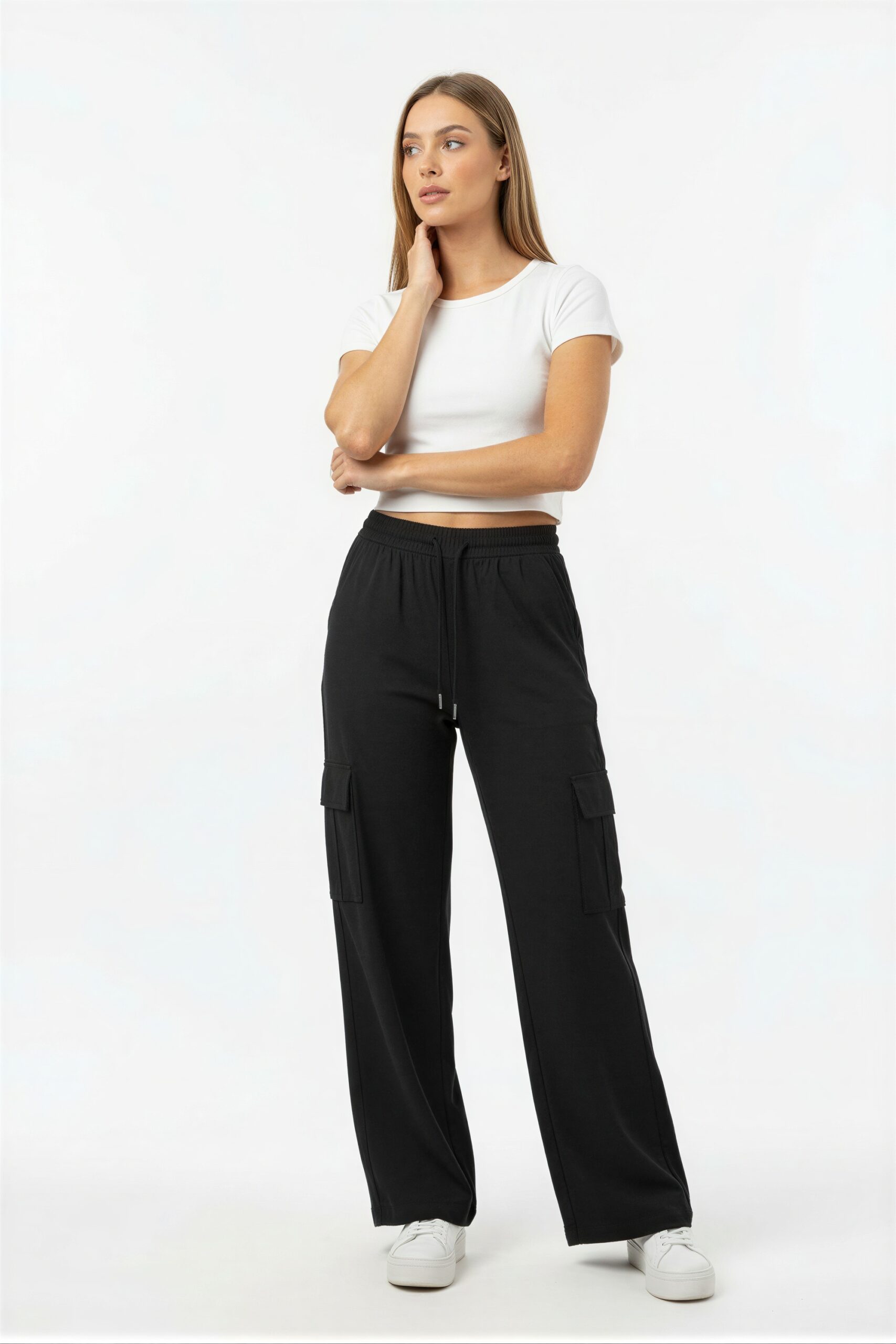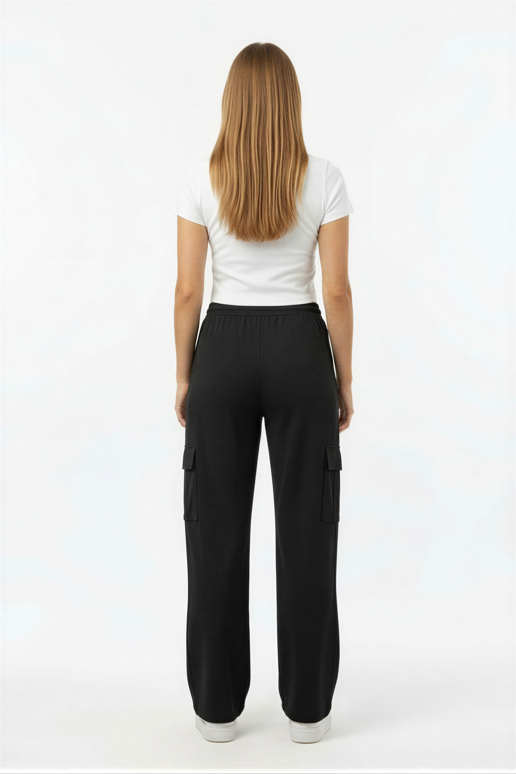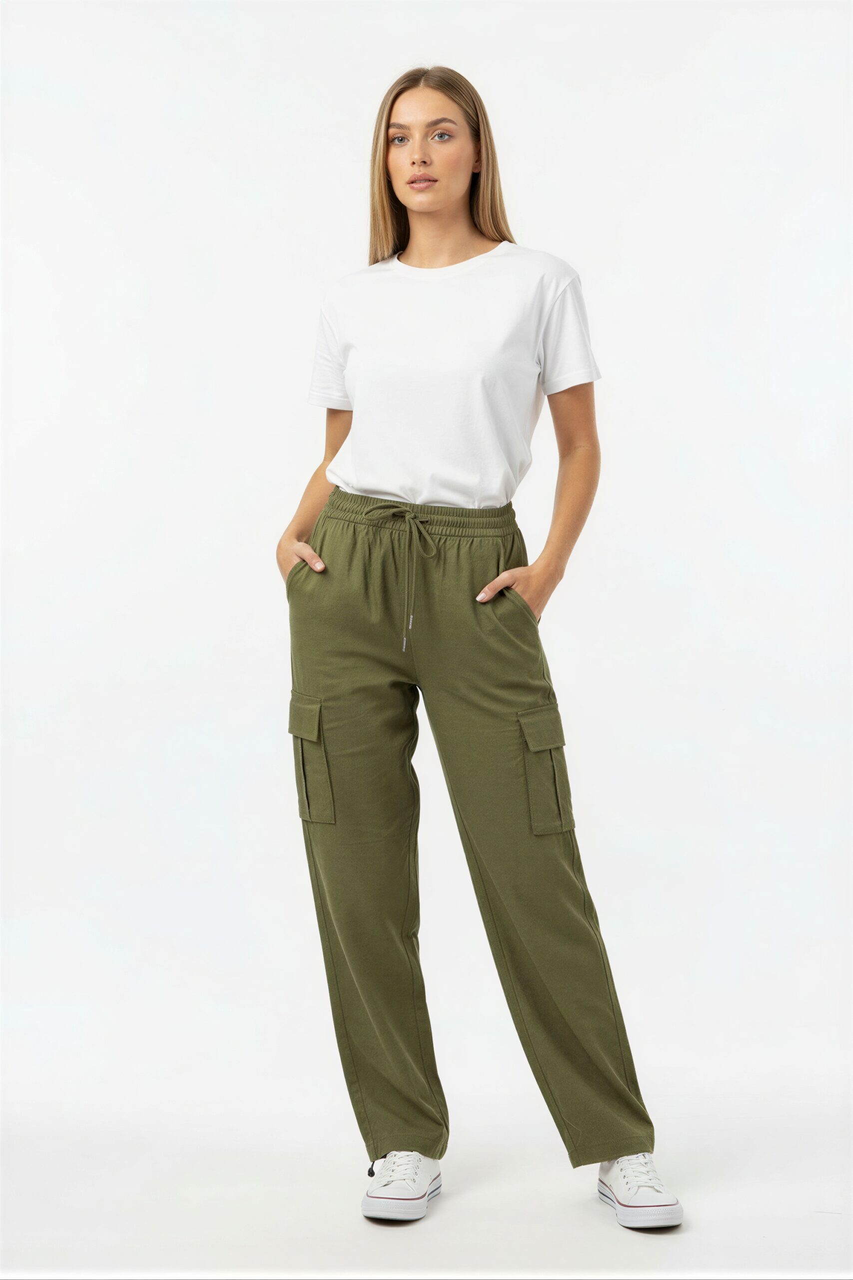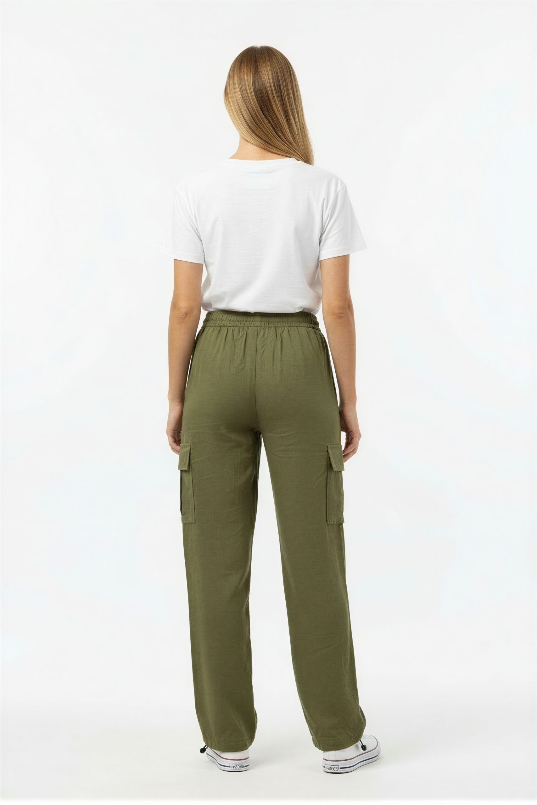 Pantalón con pretina elástica y ajuste de jareta, bolsillos laterales tipo cargo con tapa, corte recto que brinda comodidad, tejido ligero de uso práctico