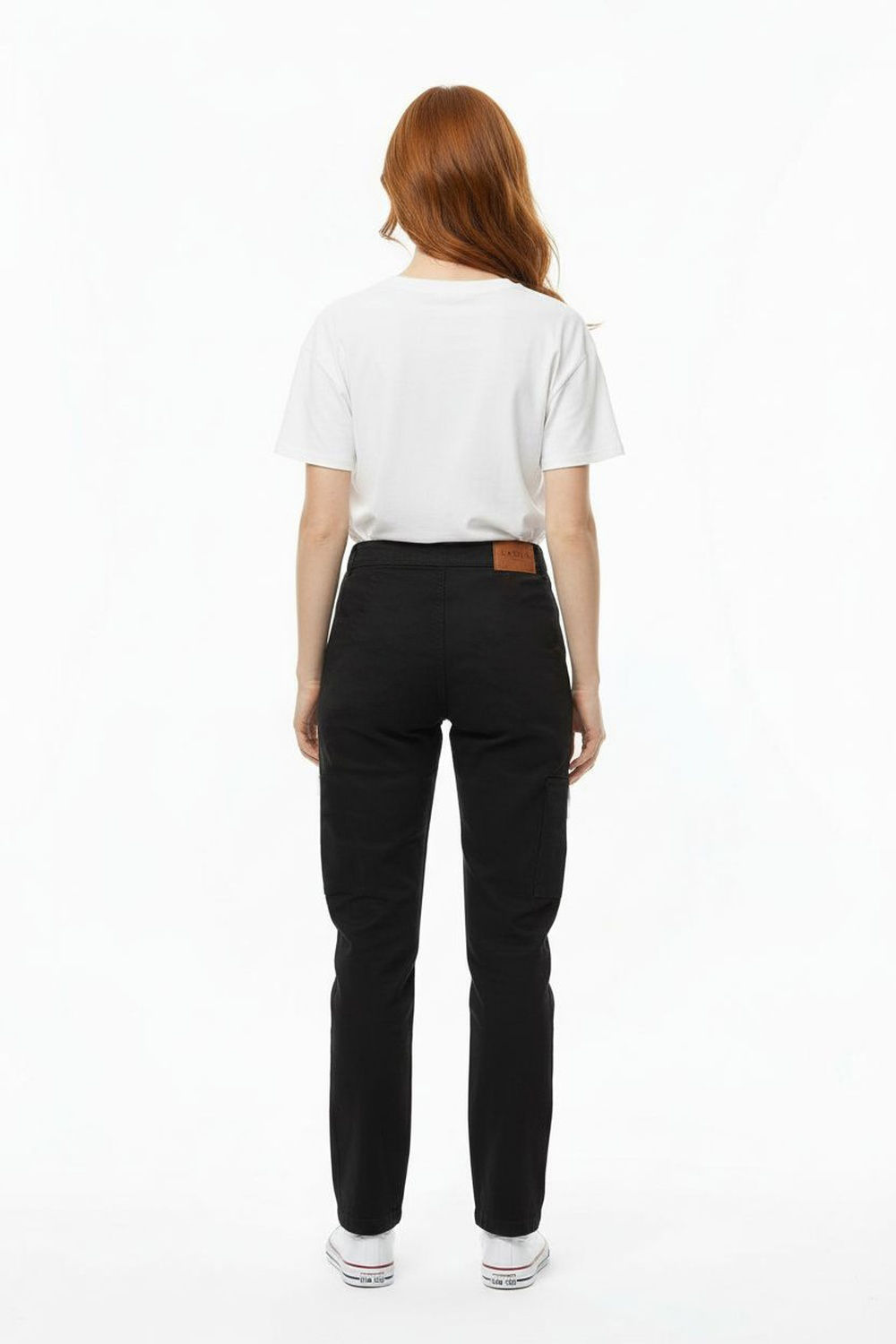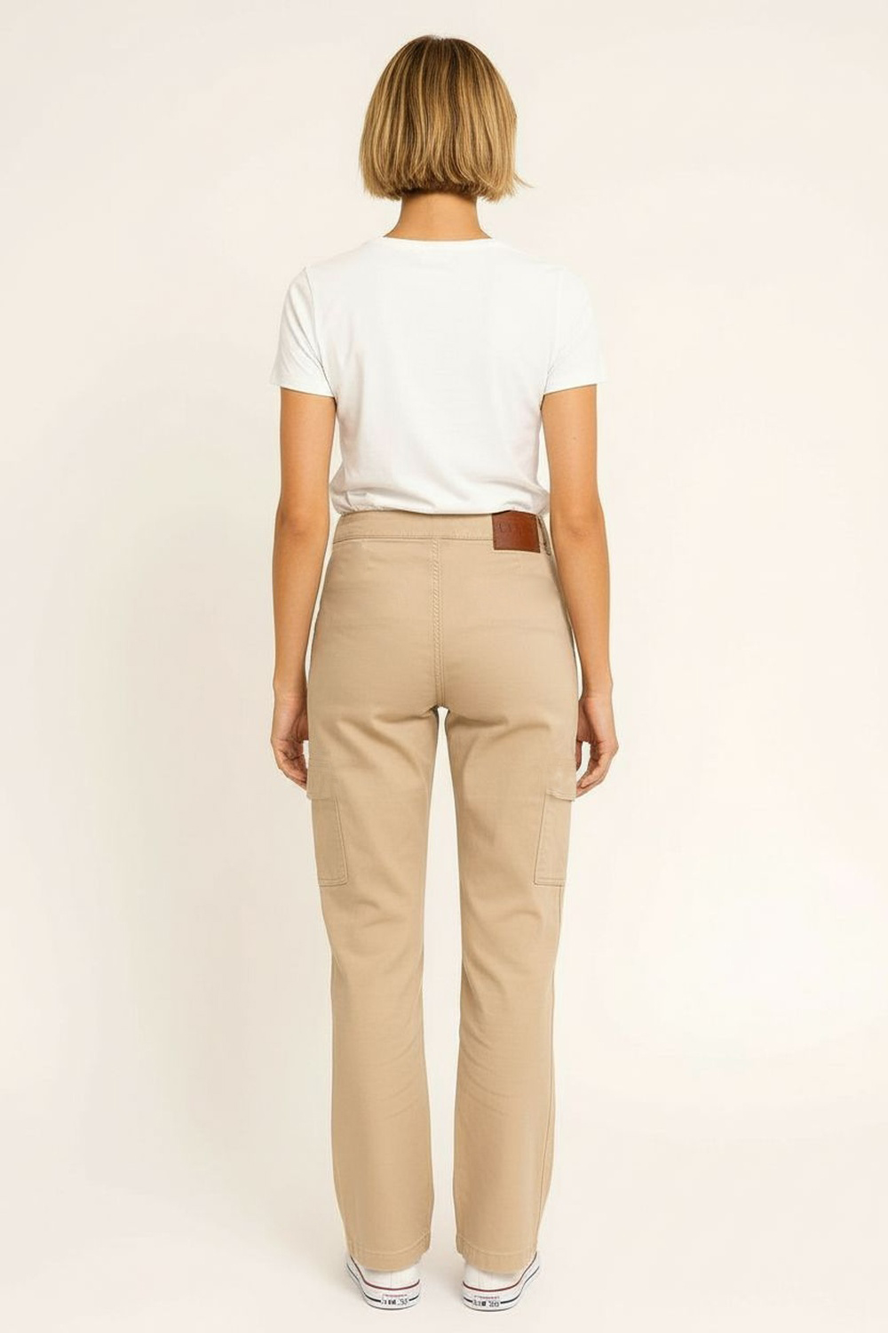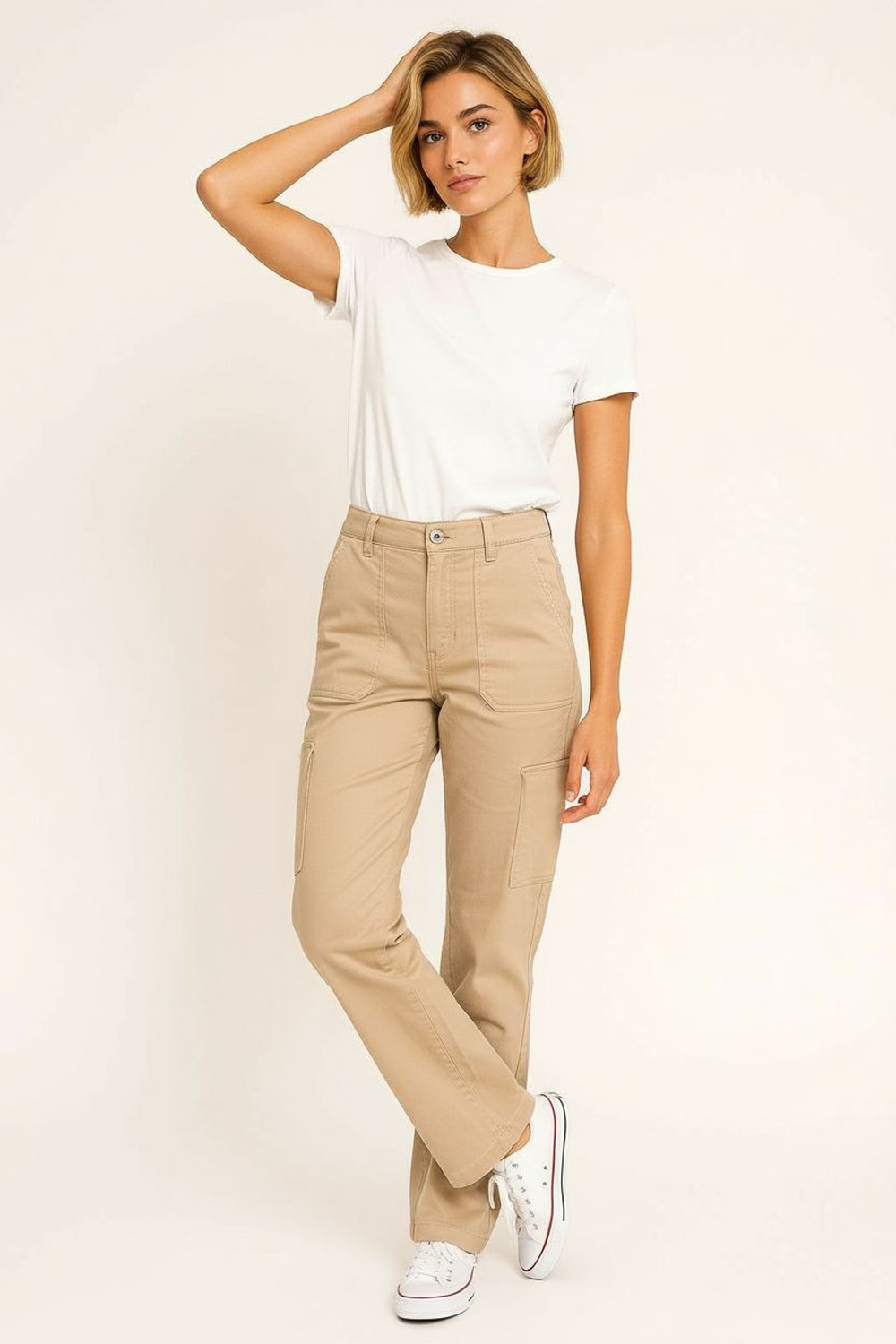 Pantalón tipo cargo con cierre frontal botón pretina estructurada bolsillos laterales amplios corte recto y ajuste cómodo en pierna